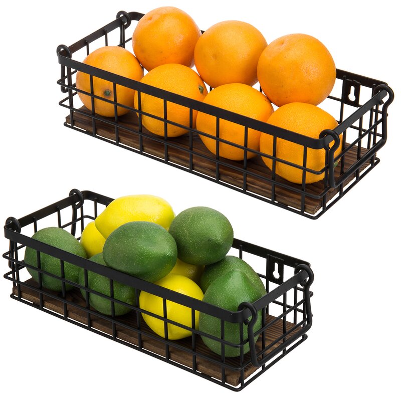 Whether mounted to a flat wall surface for use as floating storage shelves or for using as tabletop baskets to organize items around your home, these black metal wire and rustic burnt wood decorative display baskets are the perfect way to add distinctive country-inspired decoration and functional storage to any household. This set of wall-mounted baskets features a small basket and a large one to expand your decorating options, and provide storage and display space in a variety of sizes. Their metal side handles allow for easy portability and transportation around your home, and their nesting design allows them to be easily put away for storage when not in use.