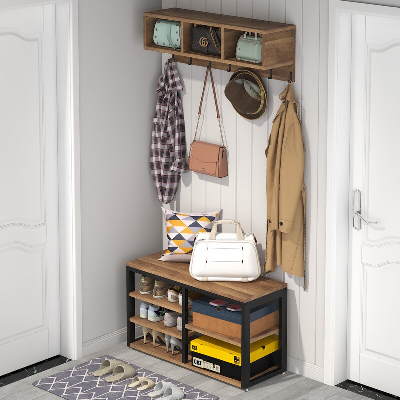 Entryway Bench With Shoe Coat Rack Three-In-One: This shoe rack bench with a wall-mounted coat rack combo is an ideal choice for the living room, entrance, hallway, mudroom, and more.