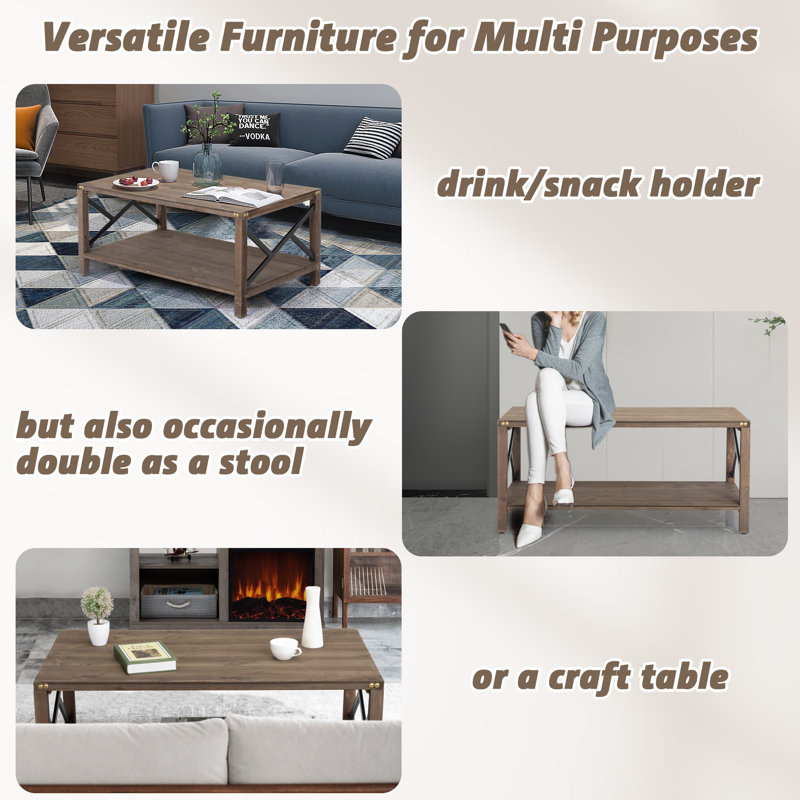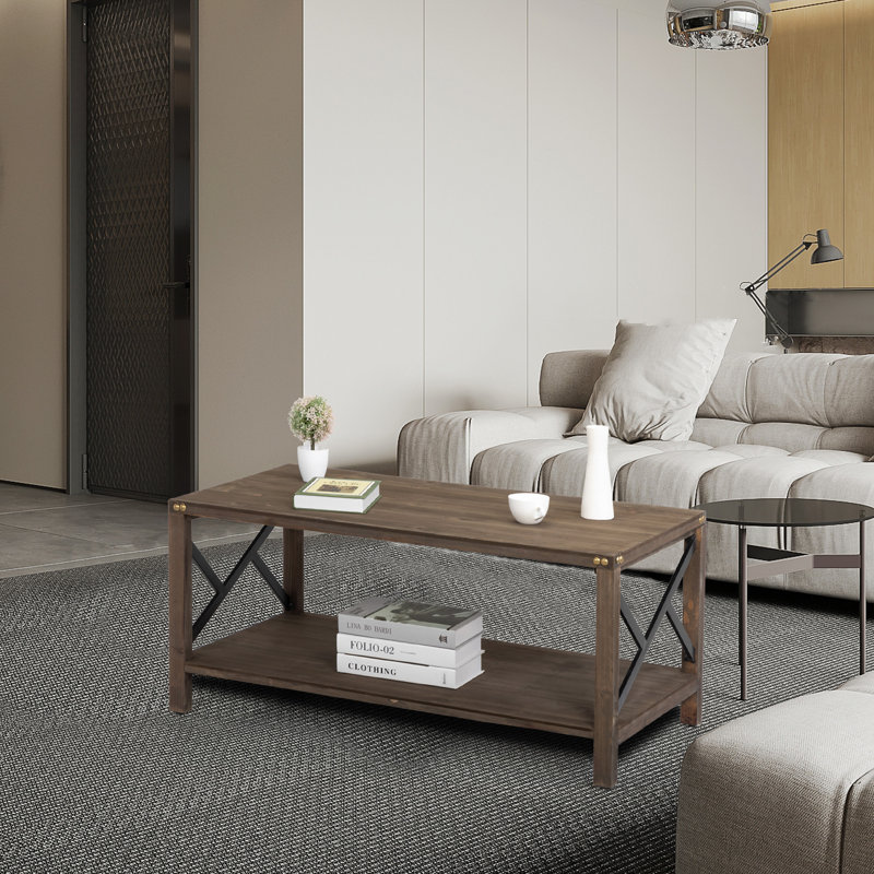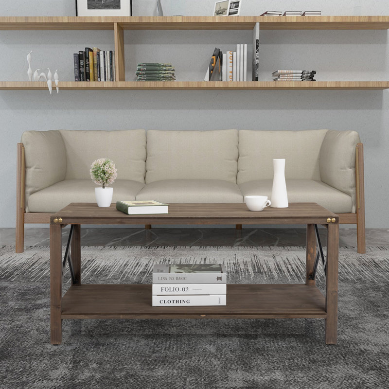 Give your living room some rustic style with our industrial-inspired coffee table. The retro-treated surface and simple structure create a charming and comfortable atmosphere in the room. Black painted metal accents are featured on the top corners and R-shaped sides, which contrast beautifully with the wood textured surface made from durable laminate.