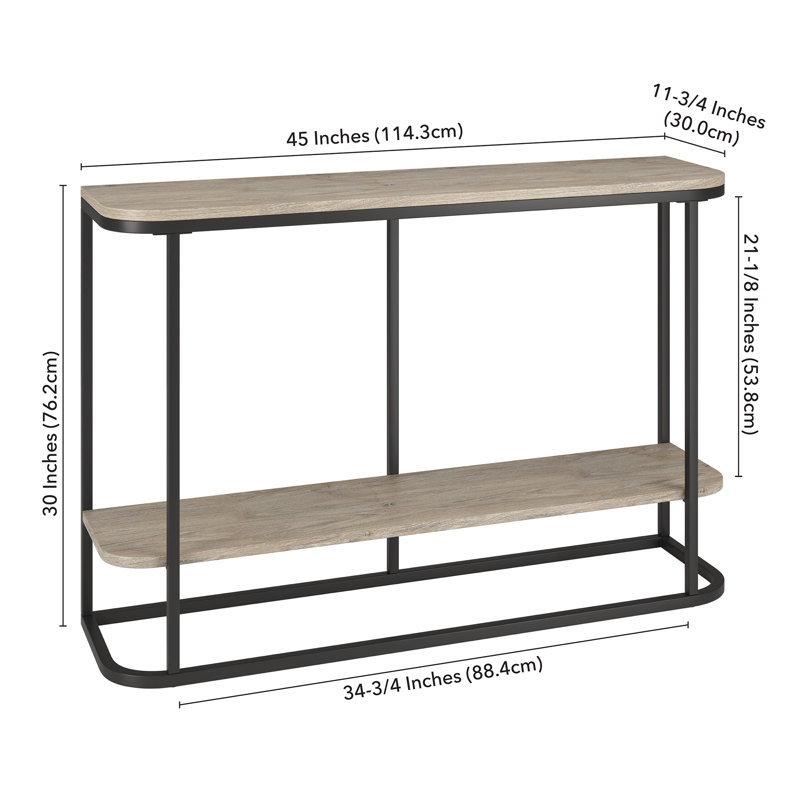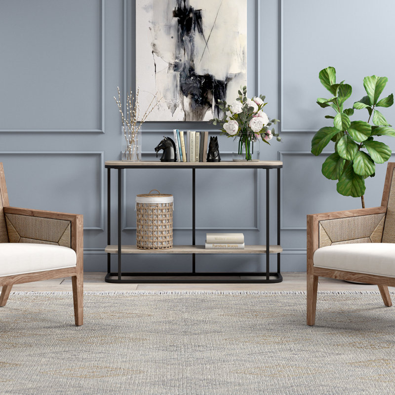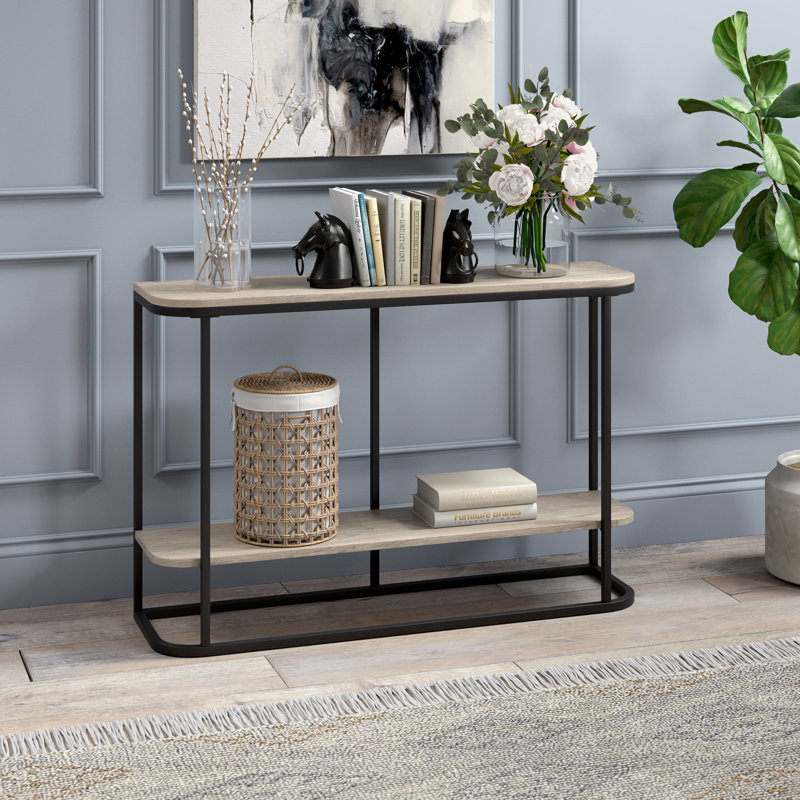 This console table is built for utility and design, featuring an on-trend demilune shape. Its thoroughly modern blackened bronze base features a closed frame, adding stability and carrying the soft curves of the design through the piece, while the warm wood-look tone of the tabletop and shelf adds another dimension of styling. At 45″ wide, you’ll have plenty of space for extra storage in your living room, entryway, or bedroom.