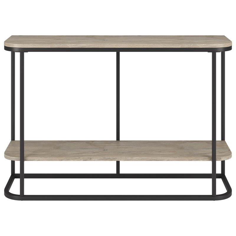 A handcrafted blackened bronze finish is applied to the steel frame. The top and shelf are constructed from sturdy MDF in an antiqued gray oak finish.