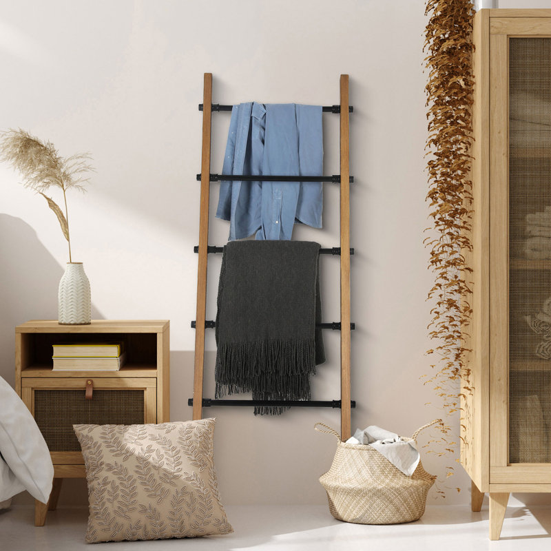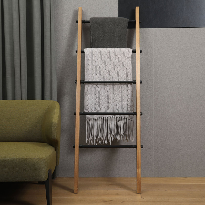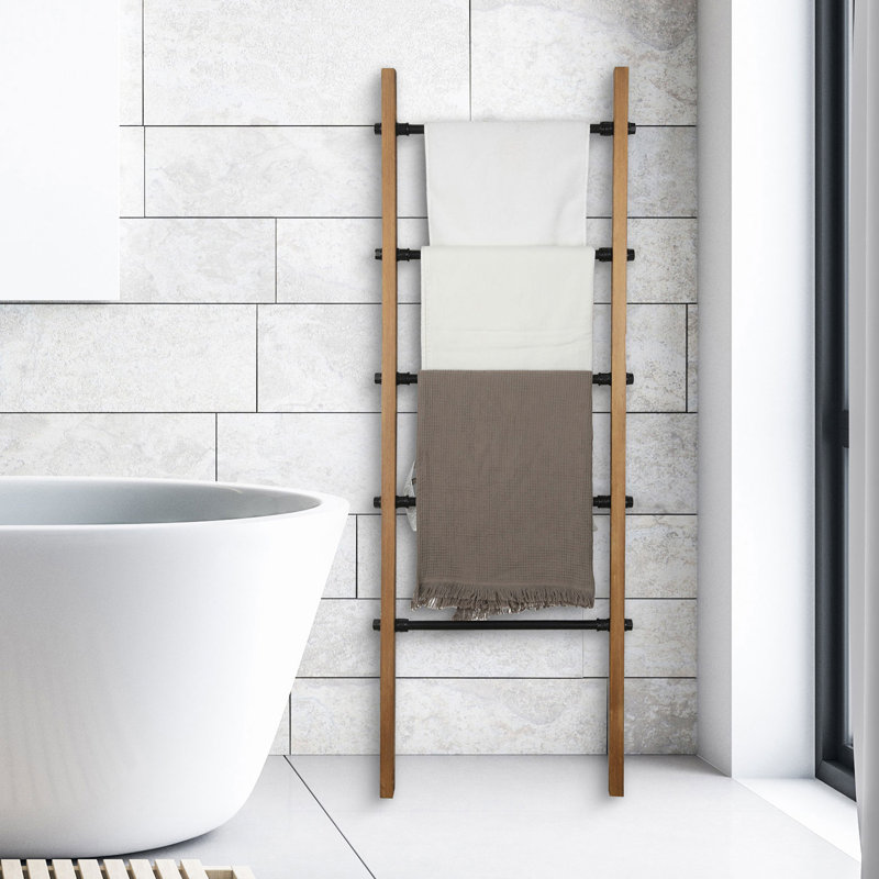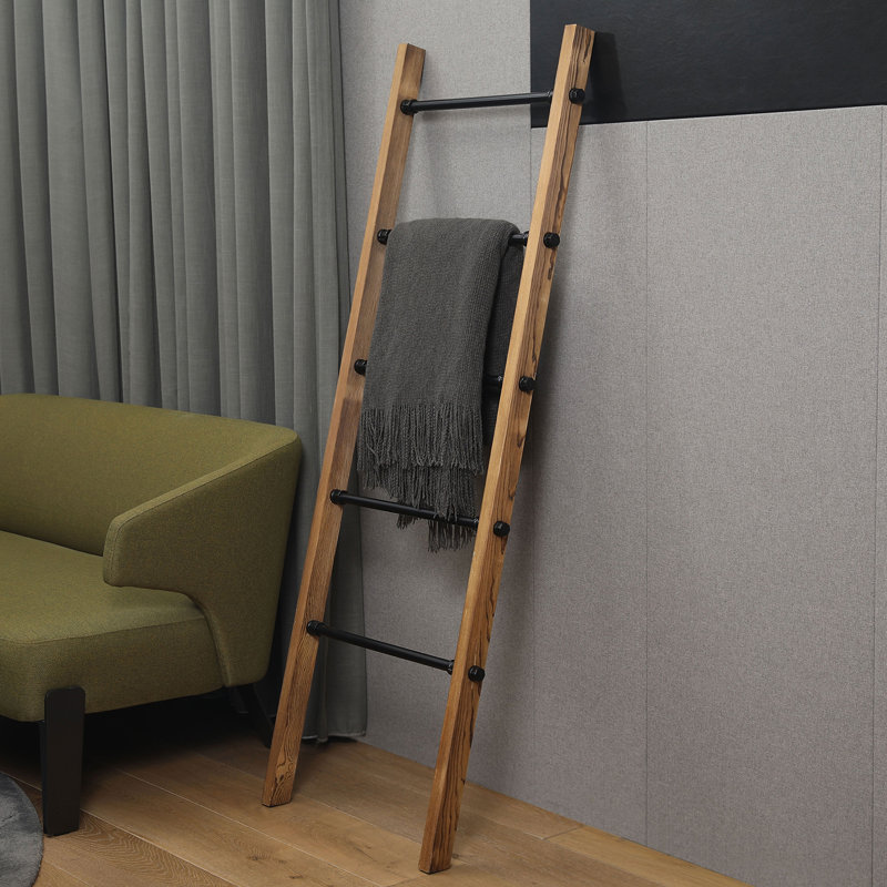 Make the most of small spaces and store towels the stylish way with this 5-foot wall-leaning ladder rack. Its leaning design makes it easy to place against any wall surface, and its rungs are great for storing towels, clothing, scarves, blankets, and more. Featuring a rustic burnt wood finish and pipe-themed rungs, this towel ladder is as much a decorative item as it is functional, and brings a rugged edge to home or retail settings. The portable design requires no installation and can easily be moved from room to room as needed.