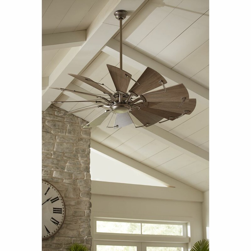 This is a statement-making ceiling fan with a rustic flair. The 12-blade, 60-inch ceiling fan was inspired by the form and function of a windmill and is ideal for Farmhouse, Industrial, and Transitional interior settings. A full-function remote control with batteries is included along with a dual-mount canopy that accommodates flat or sloped ceilings. Ideal in a room size that is larger than 400 square feet. Powerful and quiet DC.