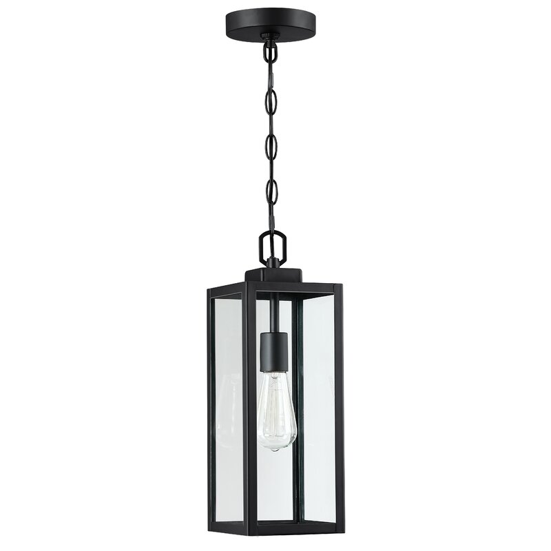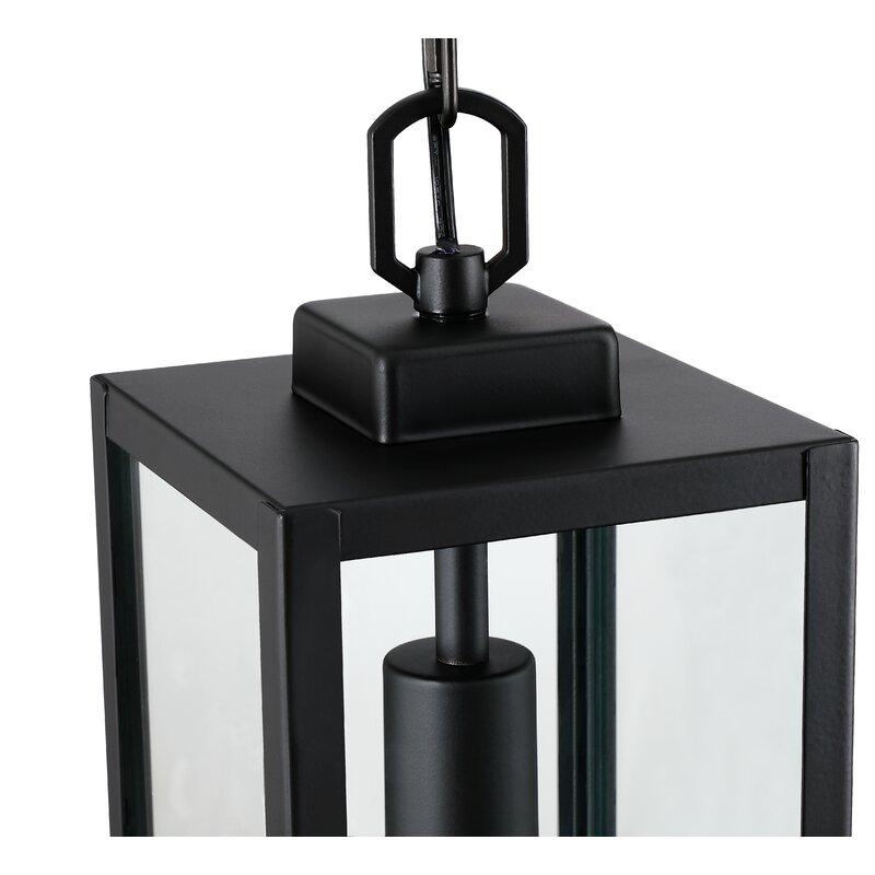 Suspended by a chain, this 1-light hanging lantern is crafted from metal and showcases a rectangular silhouette with clean lines, lending a contemporary touch to your space. Four panes of glass diffuse light from any compatible medium-base bulb to 60W (not included), while a damp location rating makes it the perfect pick for your enclosed patio.