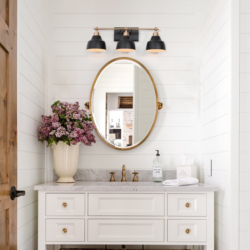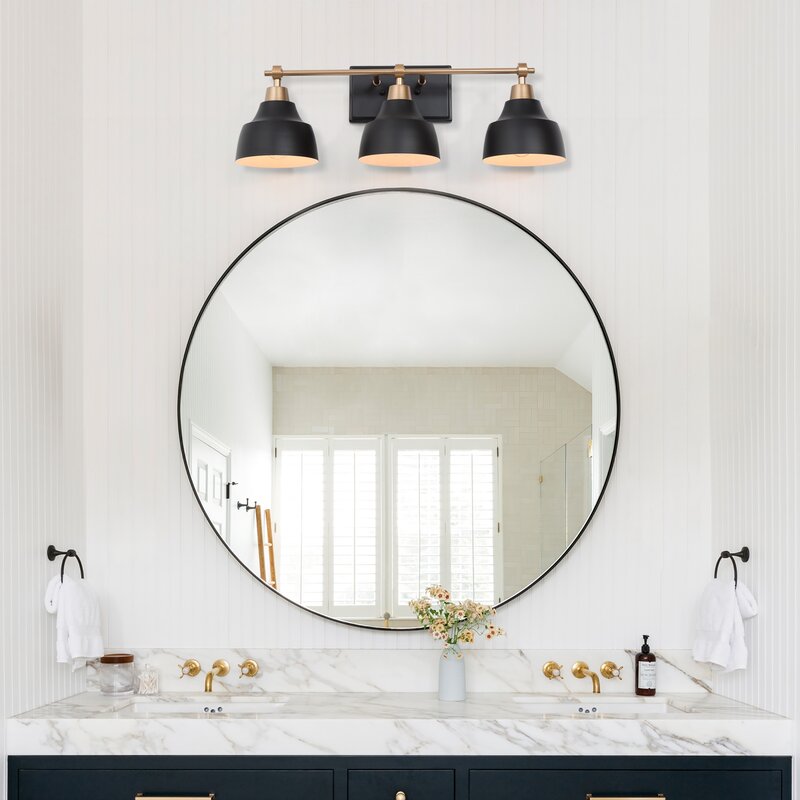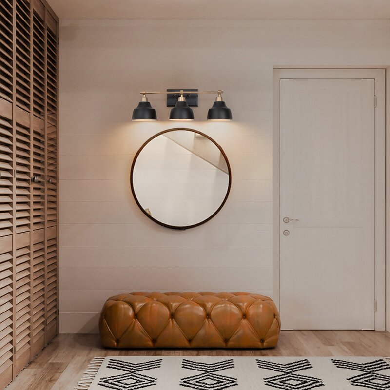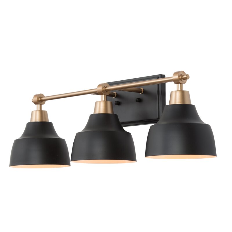 In warm gold and flat black, this 3-lights vanity lighting sets the modern stage for your sophisticated vanity. This charming vanity light features a rectangle backplate, a slim linear bar, and three bell-shaped shades, for a simple and smooth outline. Flared shades in rich flat black bring contrast and drama to this modern three-light bath light. Three bulbs up to 60W (not included) cast an ambient glow as you tackle your morning and night routines, creating different moods and visual interest. No matter used as a wall sconce or vanity light, this light never fails to brighten up your paintings, mirrors, and other nooks in a bathroom, vanity, kitchen, foyer, living room, bedroom, study, basement, farmhouse, foyer, hallway, and so on.