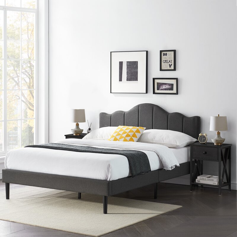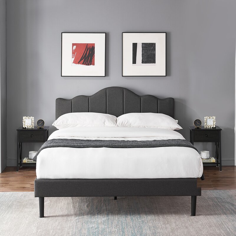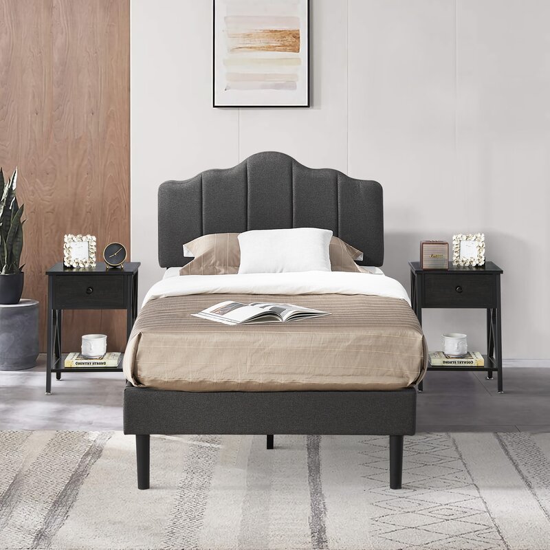Set a mid-century modern foundation in the bedroom with this upholstery platform bed frame and nightstand set. This 3-piece modern bed set contains a 1-bed frame with a height adjustable headboard and an industrial nightstand set of 2. The bed frame is built with a metal frame and engineered wood slats. Support legs and hardwood slats are better supported for most mattresses, no box spring is needed. The modern nightstand set with drawable storage drawers is perfect for tucking away your latest reads and before-bed essentials.