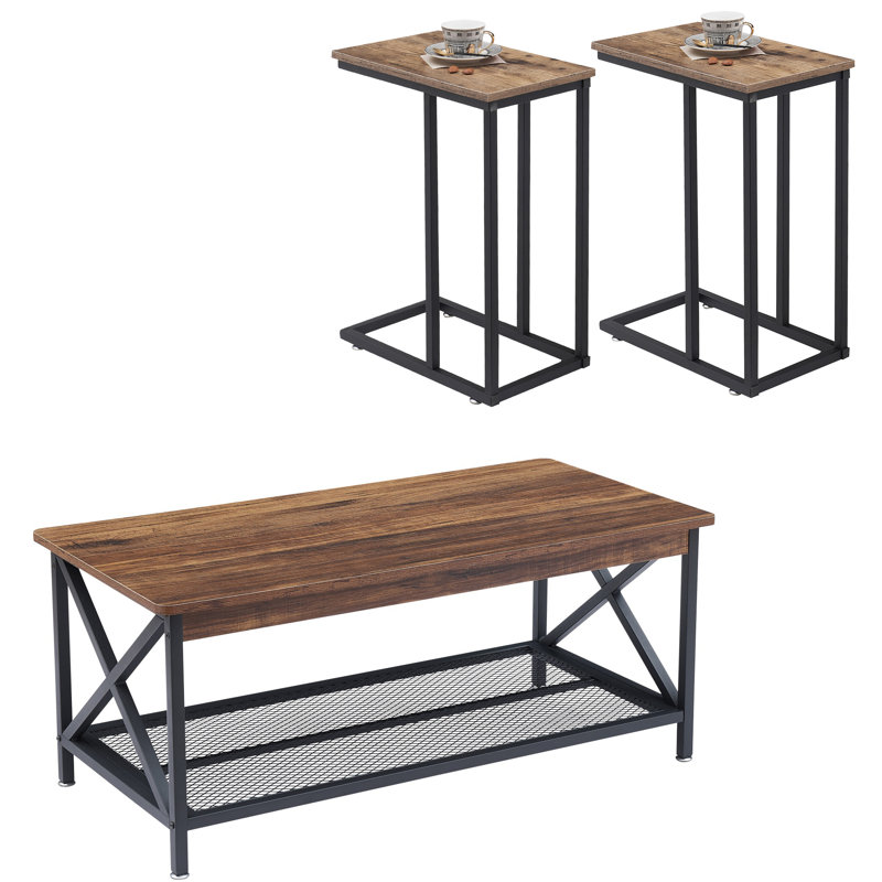 A 3 piece coffee table adds fresh energy to your living space. The sleek and spacious laminate table top is supported by solid black metal legs with a simple design. Two square side tables that can easily accommodate a light, photo, or decorative accessory complement the elegant rectangular end table. This contemporary dining table set will perfectly anchor the style of your living room, family room, or den.