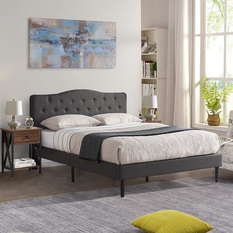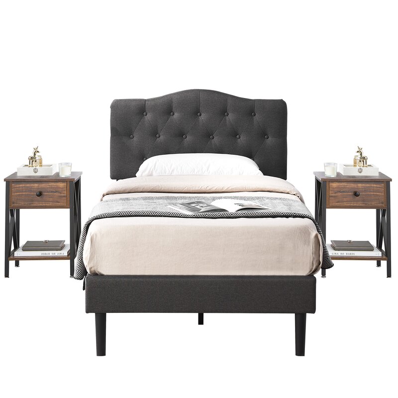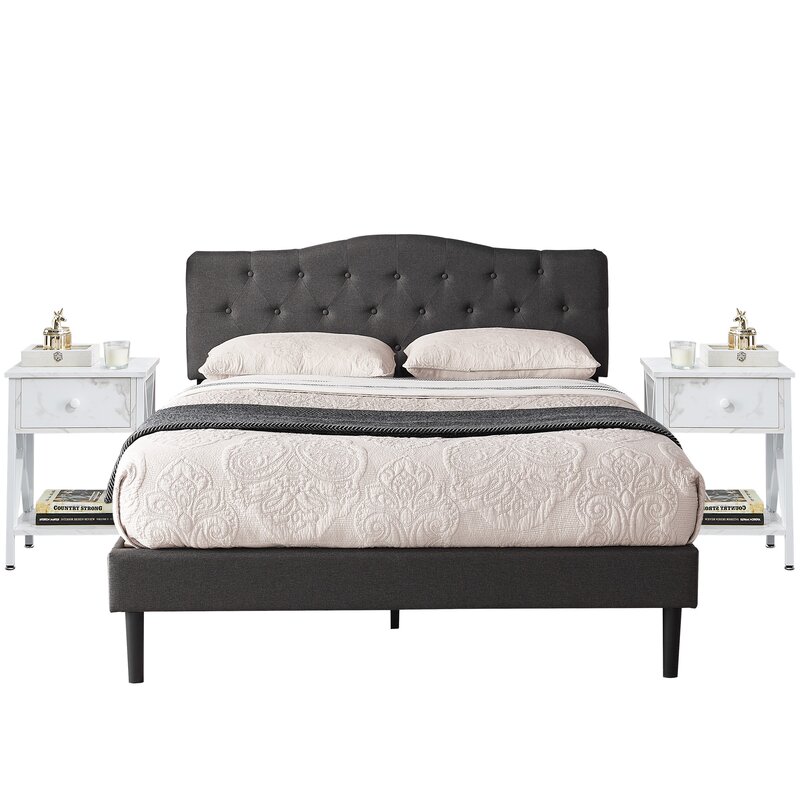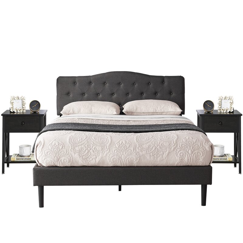 Create a contemporary look with this upholstered platform bed frame and nightstand set. With its unique silhouette, this adjustable upholstered bed fits seamlessly with varieties of bedroom or guestroom decors. Upholstered side rails create an elegant look that matches perfectly with a classic tufted upholstered headboard. Included slats easily unroll and fit into the bed frame to create even and lasting support that eliminates the need for a box spring. The modern nightstand set with one drawable storage drawer is perfect for tucking away your latest reads and before-bed essentials.