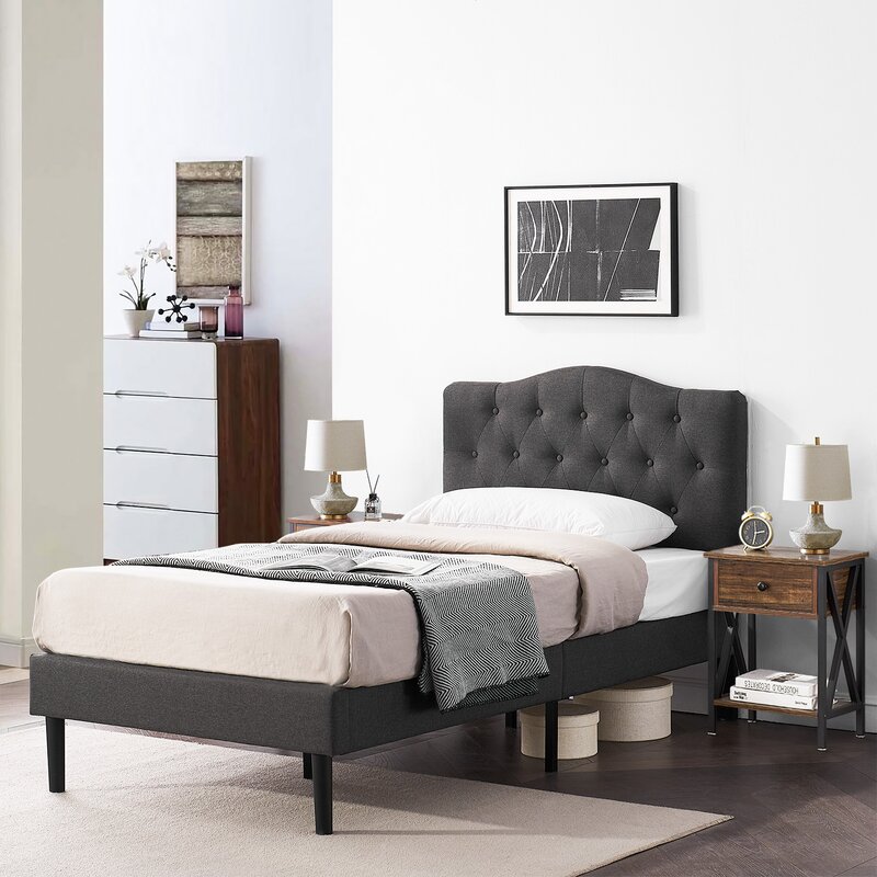 Bed frame with scalloped headboard: Upholstered with durable button tufting for a classy look, the neutral tone makes it easy to match with all kinds of decor.