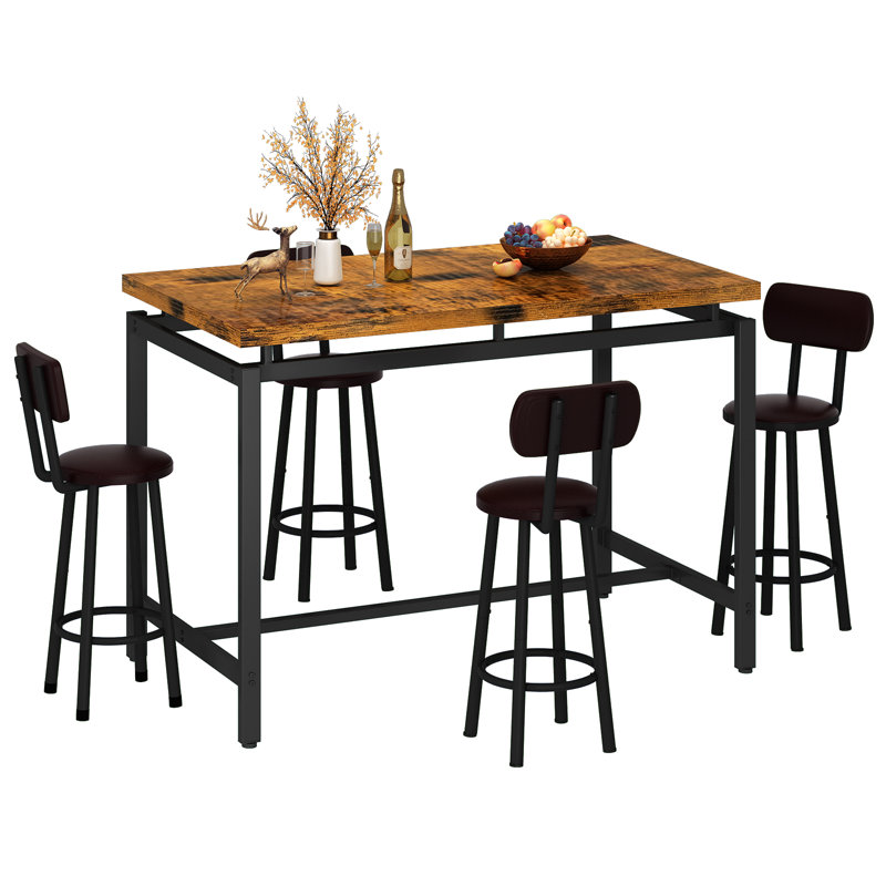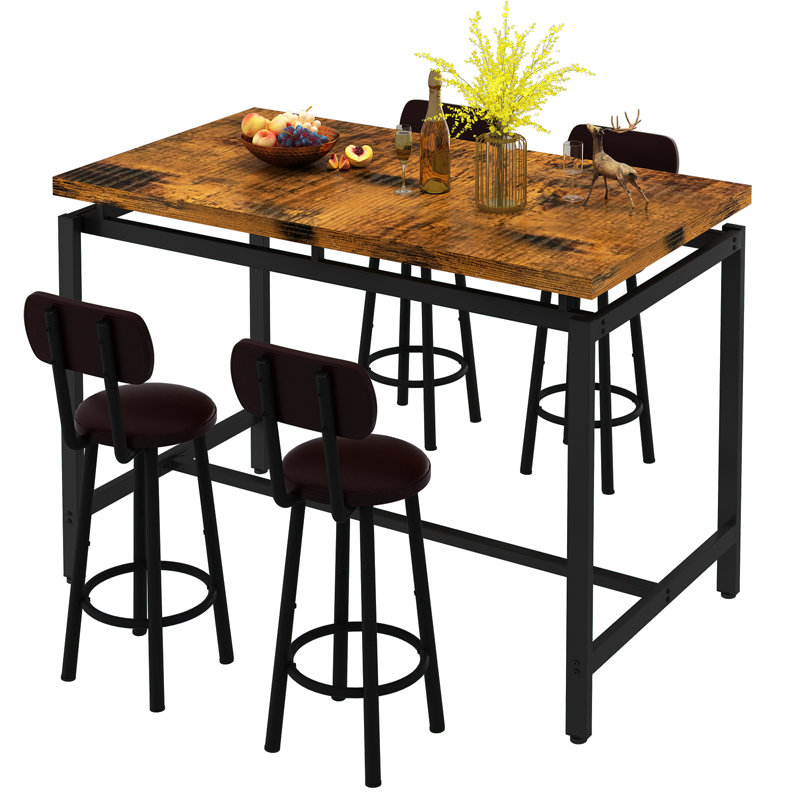This 5 pieces counter-height dining table set is a great solution for dining for four. Come with one wooden top dining table with 4 matching upholstered bar stools, this set will be suitable for use in your kitchen and dining rooms. Adopted with a thick MDF board and steel frame, the table is sturdy and robust to provide a long-time service. Faux leather upholstered seat cushion and backrest bring you a comfortable experience when you sit on the stool while putting your feet on the footrest. What’s more, each leg is attached with foot pads to protect the floor without scratches.