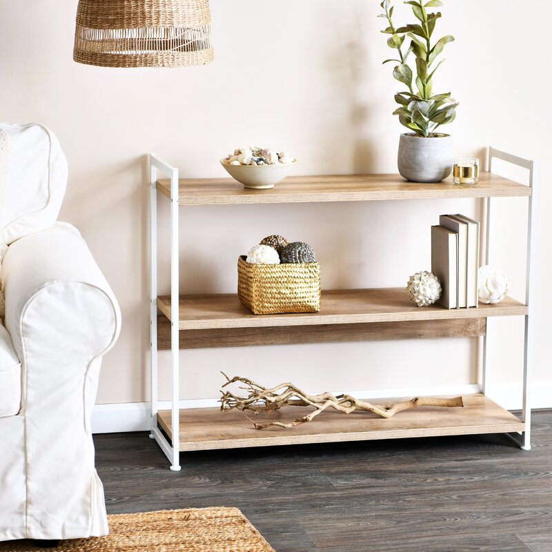 Wrought Studio Jamestown Modular Wide Shelves are a set of long and low, free-standing shelves with 3 shelves. The wide shelves are braced and supported by black metal side frames. The metal side frames have a round feed to protect the flooring. The sturdy shelves are made from a gray laminate surface that is strong, beautiful, and easy to care for. Ideal for storage and display, this low shelf provides storage under windows, mirrors, and large clocks. It’s also the ideal height for common areas to have ample storage without blocking a room’s line of sight.