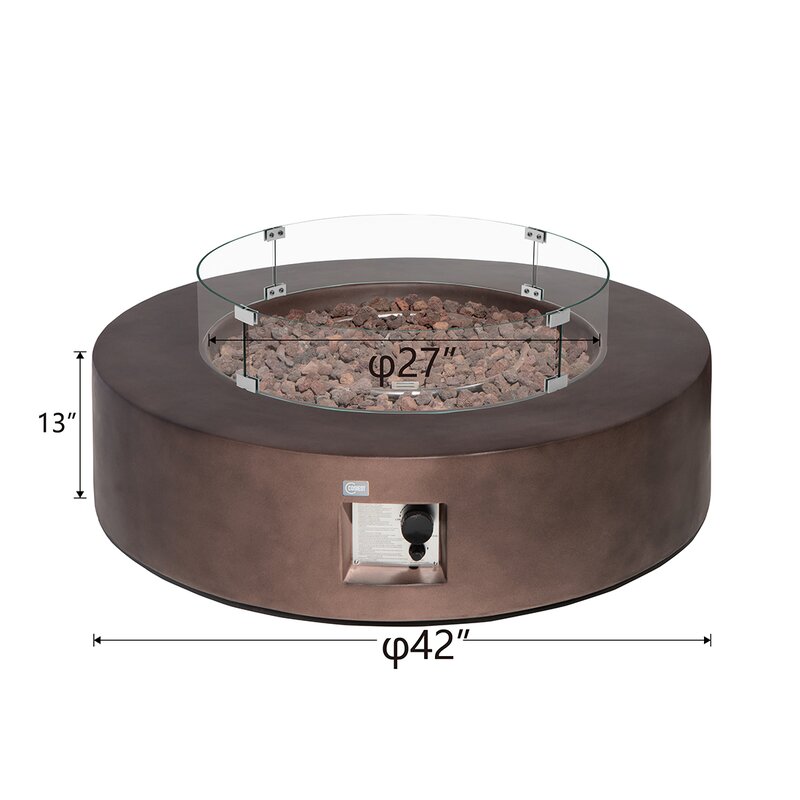 Special Economy: Large enough coffee table surface to set your coffee or nightcap. The unit has a 42-inch diameter and is just 13 inches from the ground for an almost sunken feeling. The fire bowl itself is the 27-inch diameter. It perfectly accommodates a standard 20-gallon propane tank. The entire piece of furniture weighs only 120 lbs and can easily be picked up from the side handles by two people.