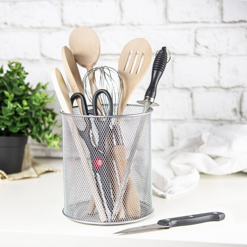 Our roomy mesh cup organizer has one large compartment. Great for storing utensils too large for drawers: spatulas, ladles, spoons, tongs, whisks, and more.