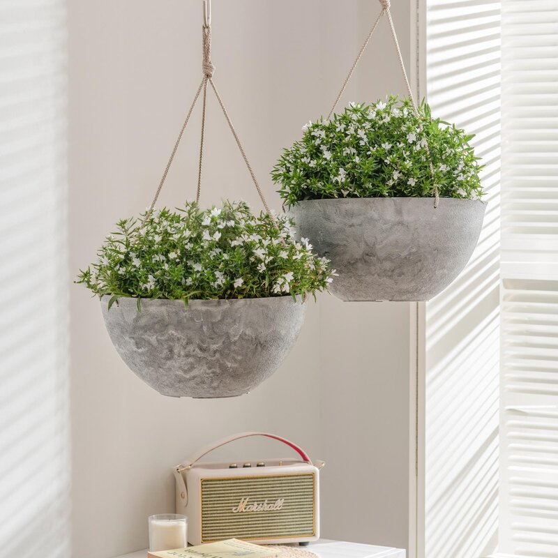 Characterized by modern minimalism, this hanging planter set of 2 serves as a great companion to house your favorite plants both outdoors and indoors, given its excellent weather-resistant capability by being made from durable recyclable plastic and natural stone powder. You may move effortlessly with this lightweight while sturdy hanging flower pot planter to meet your styling needs. The sleek tapered silhouette makes our large indoor pots easily suit most houseplants while complementing your stylish home decor. Together with 4 built-in drain holes, engage your little treasure in a breathable stage to welcome the thriving. Get exposed to a touch of inspiring green in our outdoor planters to enjoy the refined balance of aesthetics, function, and minimalism.