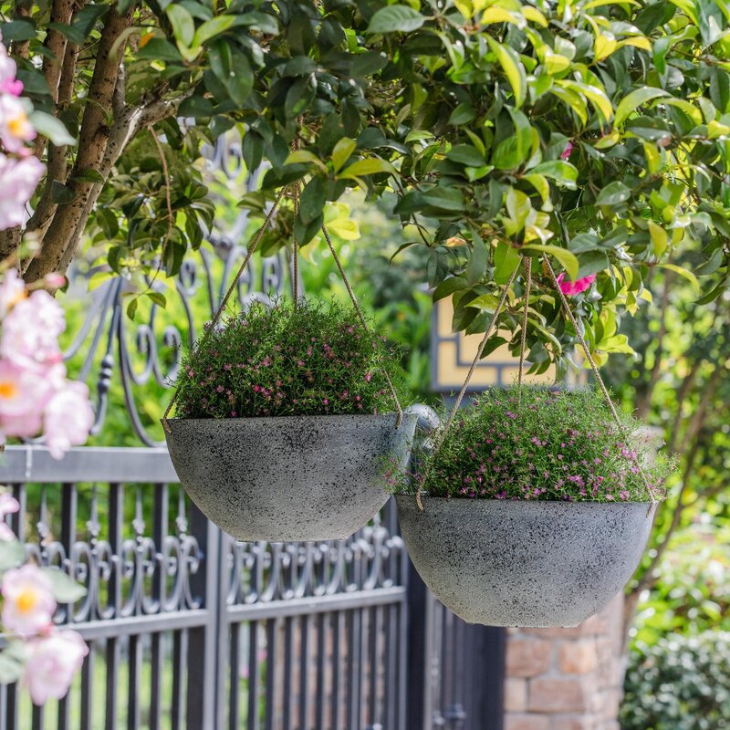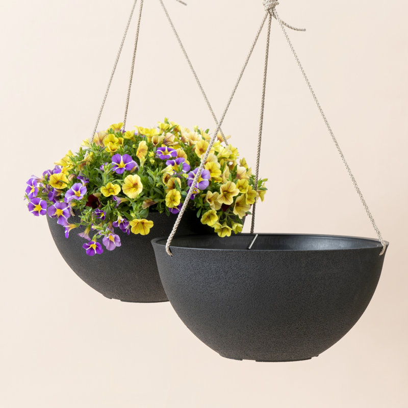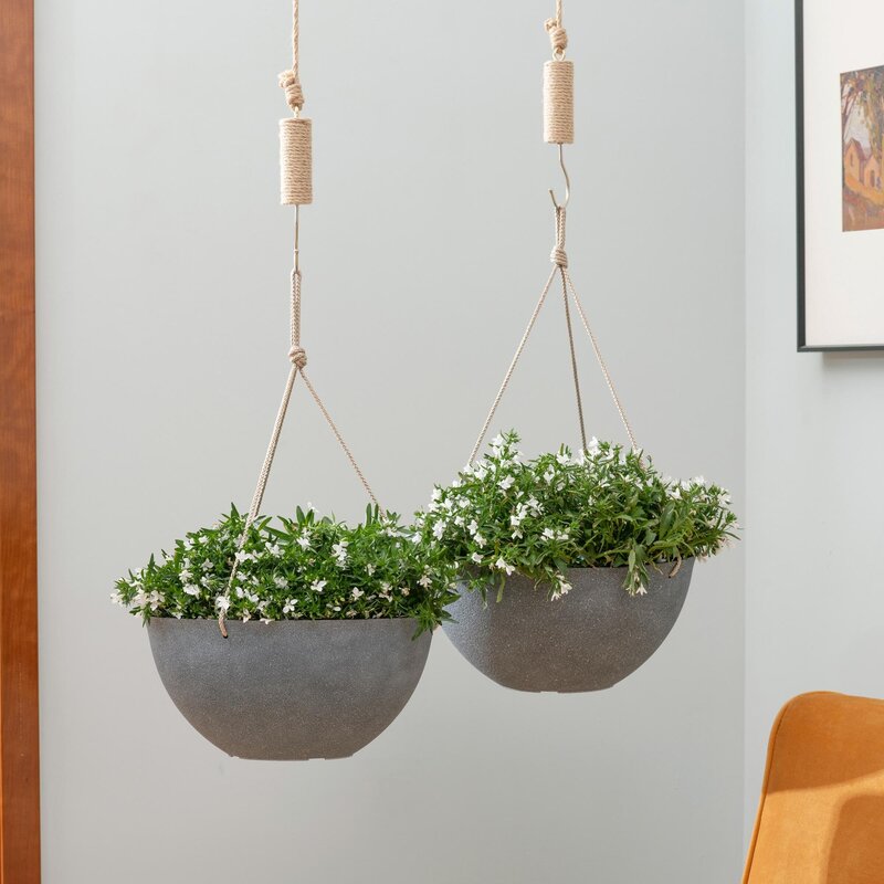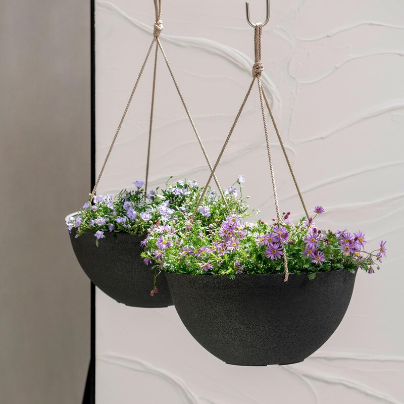 Great set of durable planters.First, I love that for that price, they came in a set.Score!They’re also a great size and made of a thick plastic.The outside has a nice rough texture to it, making it seem like a more expensive concrete almost.Comes with drain holes, no need to do yourself and a great, thick twine rope to hang.I just had my husband install the metal hook so I could hang them.Next is to even them out and add some flowers!