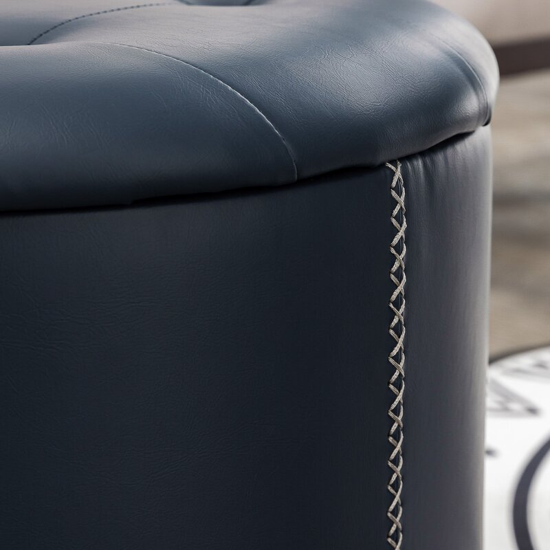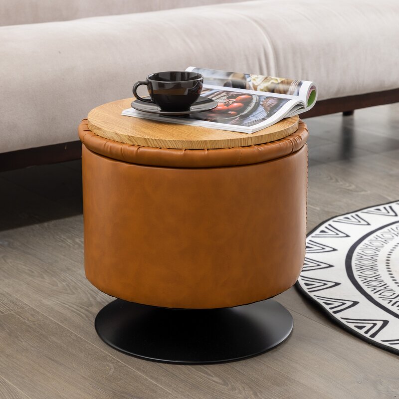 This faux leather tufted ottoman has so many positive attributes. It is of a good weight and feels sturdy. I especially love that it is on a swivel base. It can be used as an added seat if necessary. It was easy to assemble by simply attaching the stand to the base of the ottoman with four bolts. The Allen wrench is included. I also appreciate the large storage provided within the ottoman. It is a nice idea that the underside of the lid can be used as a wooden table top so the Ottoman could be used as a side table. However, I personally don’t care for the look of the wood or the fact you can see the creases of the material tucked under the wood top. Additionally when the lid is turned so that the wood is exposed, it does not feel as though the lid is securely in place and can easily slide off. For that reason, I am using a separate wooden tray on the top which can easily be stowed in the Ottoman when it is being used as a foot rest. All in all, I am quite satisfied with the quality, design and function of this ottoman.