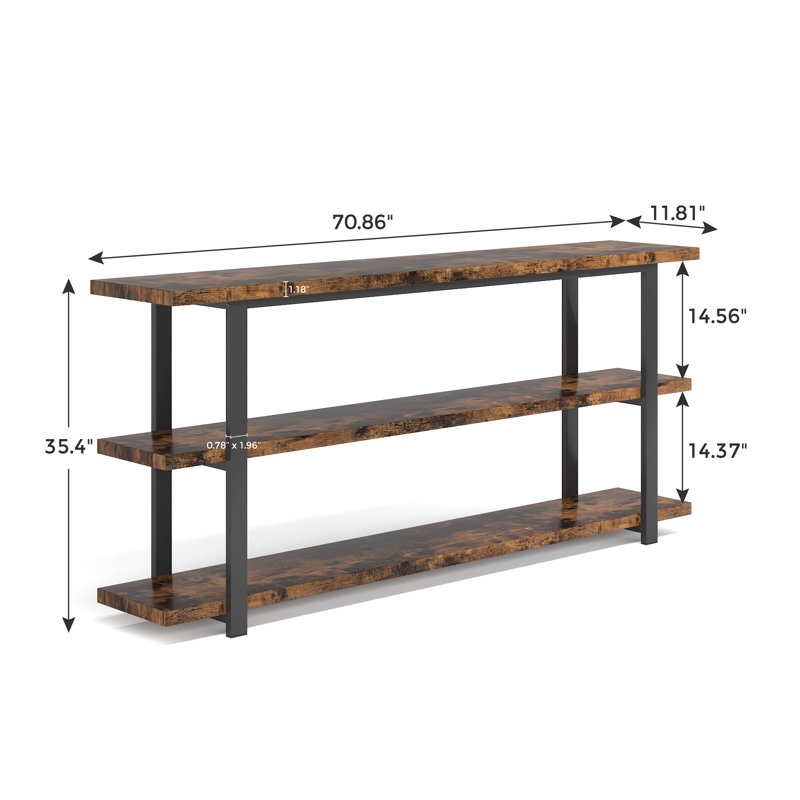 Make a modern statement in your living room with this console table. The simple rectangular design and symmetrical frame provide a shelving unit that is easy to fit in any style. Measured 11.81′ ‘D x 70.86”W, and with 3-tier open storage, it won’t take up much floor space but provides an ample and handy place to keep your books, magazines, photographs, plants, kitchen wares, and other home decorations. It can be used to create a stunning foyer as an entryway console table to maximize your storage space behind the couch in your living room or as a displaying shelf in the corridor and industrial-styled bookshelf in your condo or home office. The natural wood grain surface gives a rustic, on-trend element to your home.