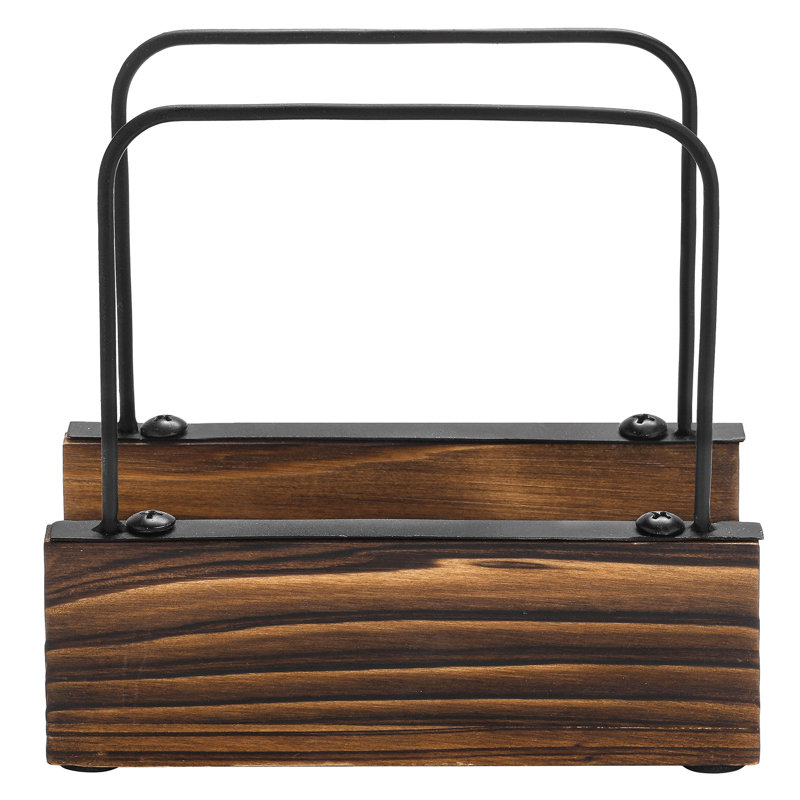 5.7 inch square rustic burnt wood and industrial black metal wire upright napkin holder for tabletop and countertop use