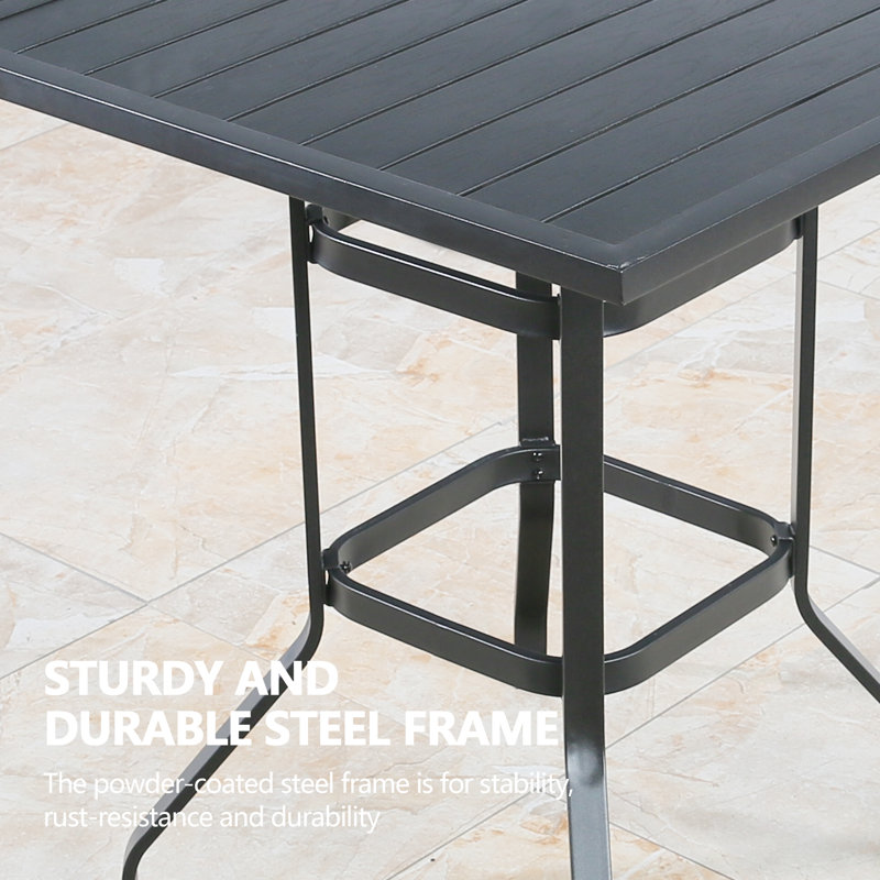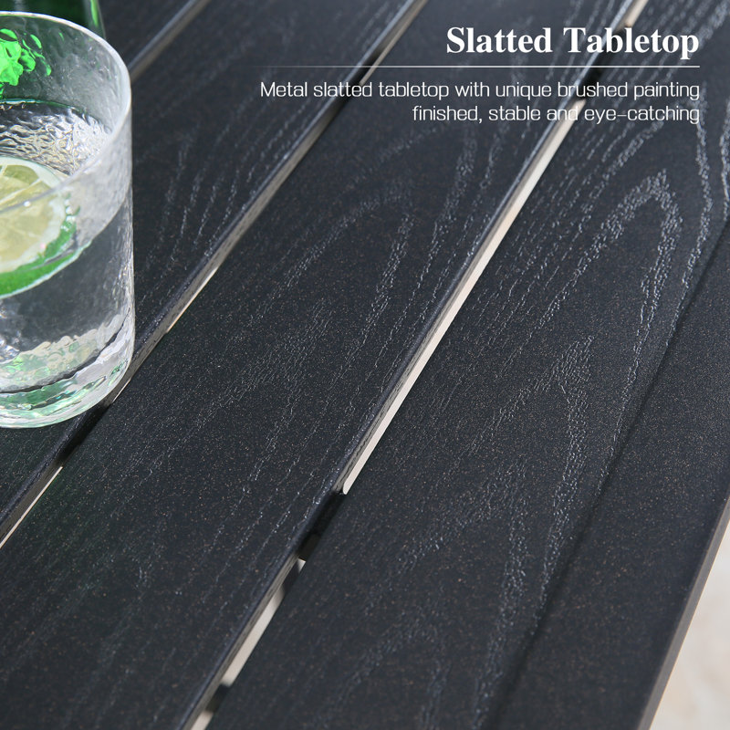 An elegant yet unpretentious addition to your garden, backyard, porch, balcony, and indoors, our bar table is the perfect spot to relax with a drink or a cup of coffee. It is crafted from a heavy-duty metal steel frame finished with powder coating and a sturdy screw for assembling to ensure rustproof and durable enough for long-lasting use. The black textured tabletop complements the bowed legs to create a distinct and visually striking look. Moreover, the slatted square tabletop could accommodate 4 people for a cozy meal, and barbecues, with family and friends in laid-back comfort.