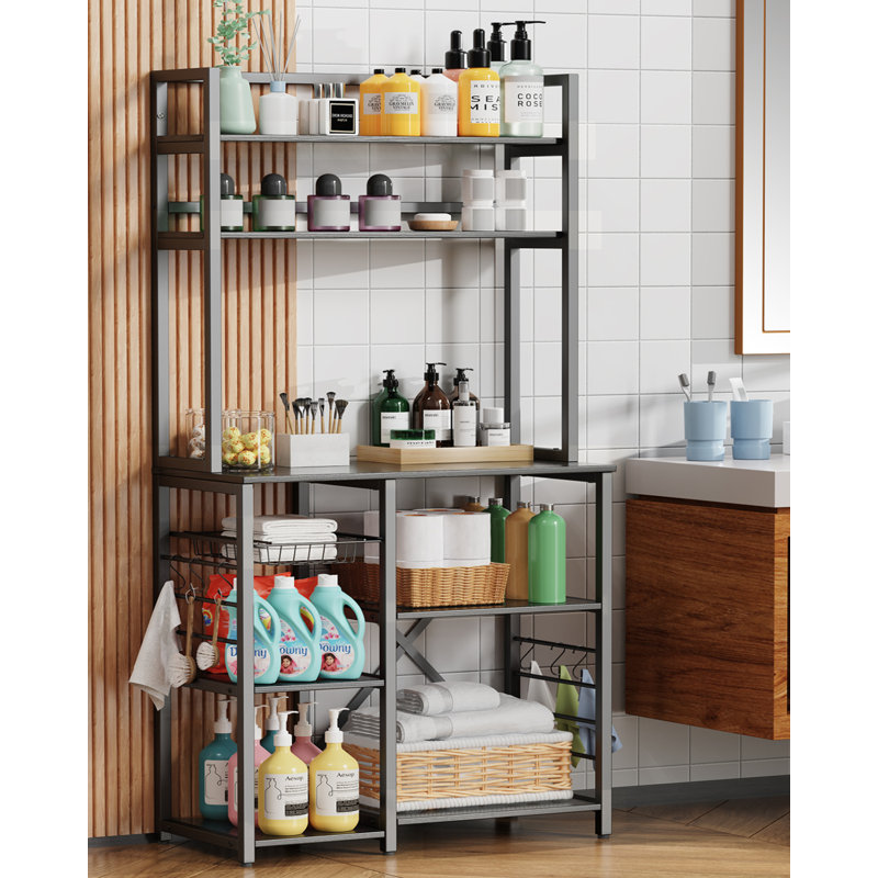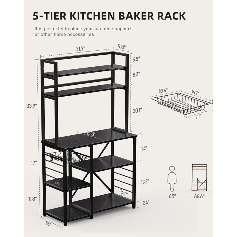 The 5-tier storage rack with a 31.7″ wide surface has enough space to accommodate your various kitchen items, such as microwave ovens, seasonings, fruits and vegetables, tableware and pots, etc.