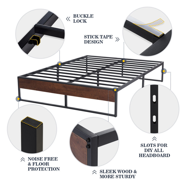 17 stories twin-size platform bed frame, the 14-inch metal bed frame for storage, mattress foundation with rustic wood, no box spring needed, easy assembly, wood slats.