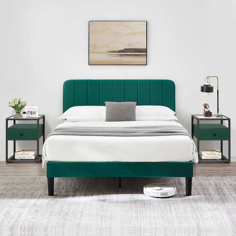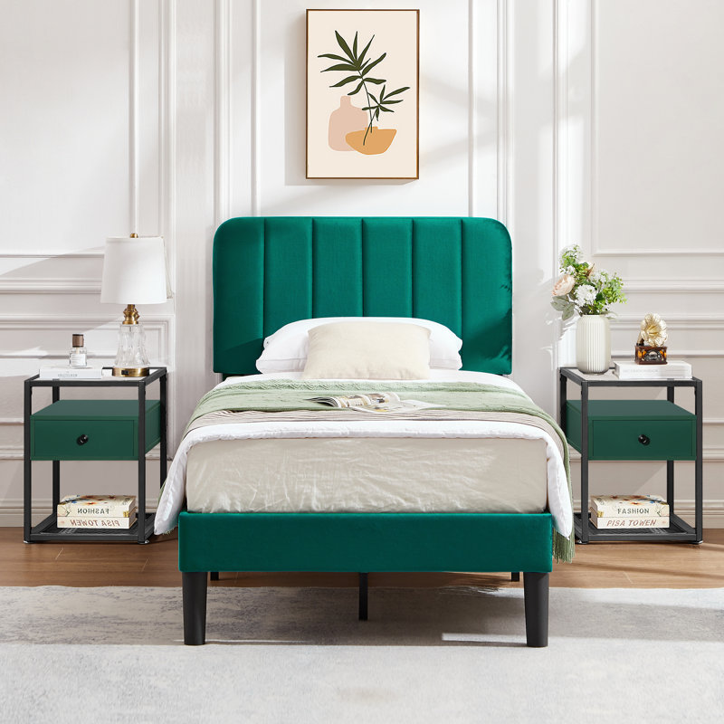 Give your bedroom a brand-new look and get some rest in style with this comfortable upholstered Bedroom Set. This 3-piece modern bedroom set includes a 1-bed frame with a height adjustable headboard and an industrial nightstand set of 2. This upholstered bed fits seamlessly into a wide variety of bedroom decors, thanks to its transitional design. It’s built with an engineered wood and steel frame and features low-profile side rails and footboards, with black tapered feet. The headboard is upholstered in linen-like polyester fabric and is filled with foam for some extra cushion behind your head as you read. No box spring is needed. The modern nightstand set with one drawable storage drawer is perfect for tucking away your latest reads and before-bed essentials.