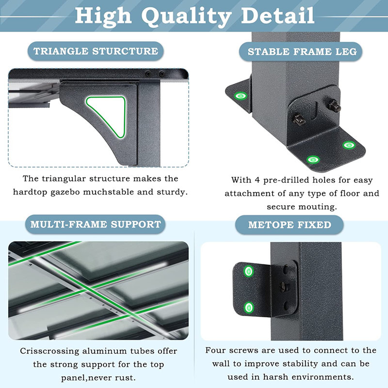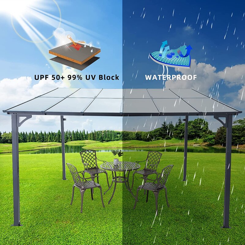 Water-resistant: The canopy is made of a PP sheet that can prevent rain and stand outside the whole year. In addition, it can keep UV rays away and keep cool.