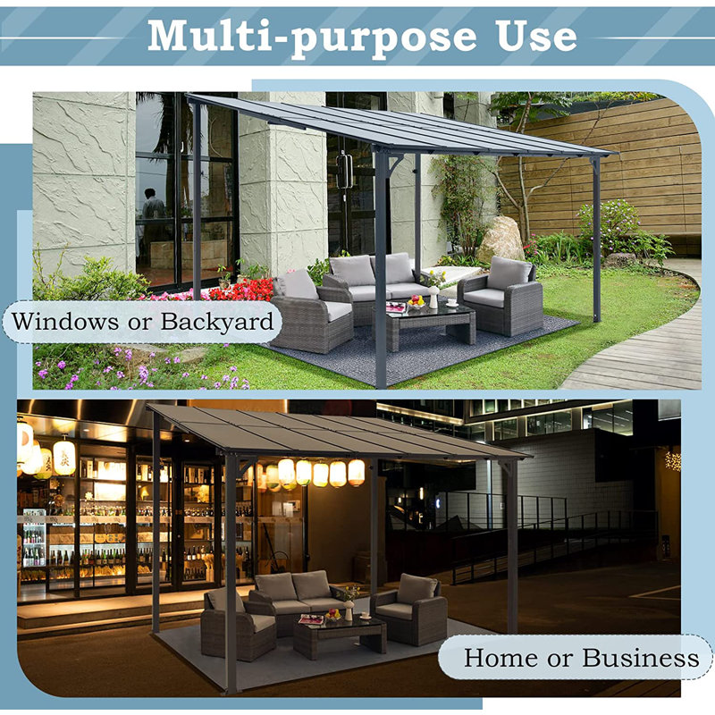 The outdoor pergola gazebo canopy is suitable for different outdoor areas such as gardens, decks, and terraces. You can also decorate the patio pergola with lights, mosquito nets, and curtains as you need. This shade gazebo needs to assemble and it will be shipped in 2 boxes. If you have any questions about shipment or patio shelter, please feel free to contact us and we will help you solve them. It is constructed of high-quality Aluminum with powder coated, and the canopy roof is made of PP sheet, which can provide protection from UV rays and make the space cool and comfortable.