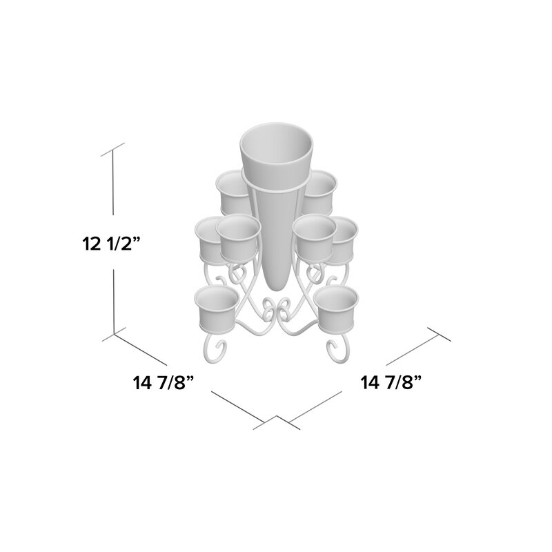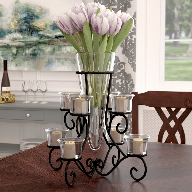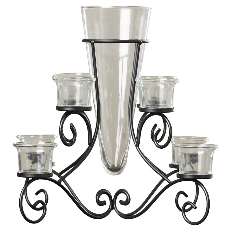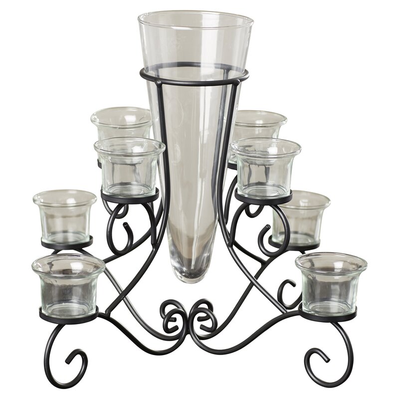 Bring the romantic glow of candlelight to your tabletop with this wrought iron candelabra. Crafted of iron in a matte black finish, this two-tiered design is defined by its curly scrollwork frame. Eight arms are topped with clear glass hurricanes – perfect for housing your preferred pillar candles or tealights (not included). A tapered glass vase in its center rounds out the design.