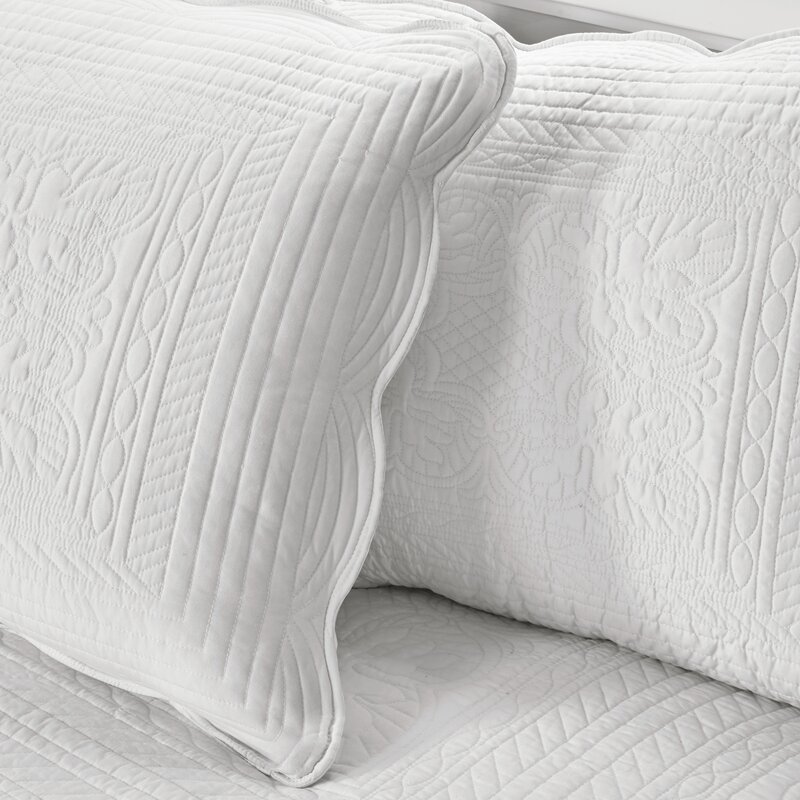 The reversible scalloped edge coverlet set is perfect as a layering piece or as an alternative to your comforter for a charming country look. The coverlet and shams flaunt a classic stitch pattern with scalloped edges that add an elegant touch to your bedroom. This reversible coverlet is filled with cotton filling and features a soft microfiber face, giving your bed a cozy cottage look. This farmhouse-inspired coverlet also has an antimicrobial treatment that provides built-in freshness protection, reducing the growth of odor-causing bacteria to keep the fabric lasting longer.