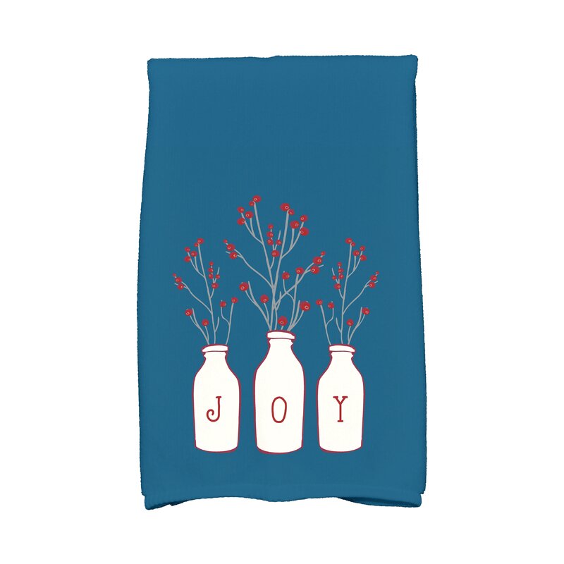 Bring cheer and goodwill to your kitchen with this holiday-inspired hand towel! Drawn in a simple, quirky style, this towel showcases the word “JOY†spelled out across three matching vases, each filled with festive berry-laden stems. This towel strikes a rectangular silhouette measuring 25” L x 16” W overall, while its reinforced hem offers a tailored touch. Crafted from 100% casement cotton, this towel is machine washable and dryer-safe for effortless upkeep.