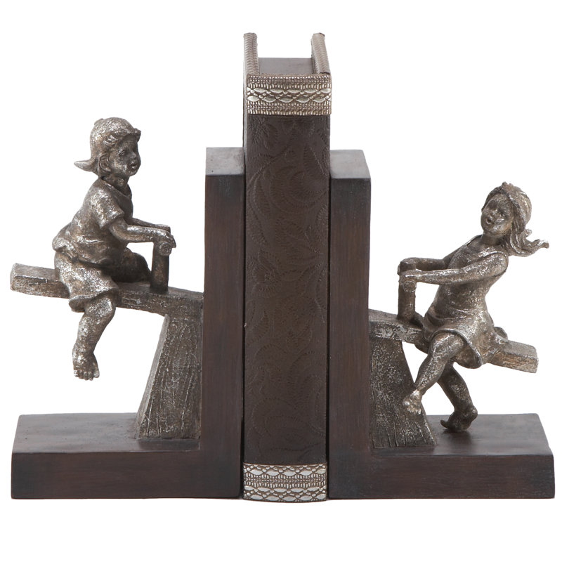 Eclectic design lets your personality shine in your home Two solid poly stone children balance on a see-saw andThese book organizers have a vintage look from the distressed metal finish over the children’s status and dark wood tones of the bookends.