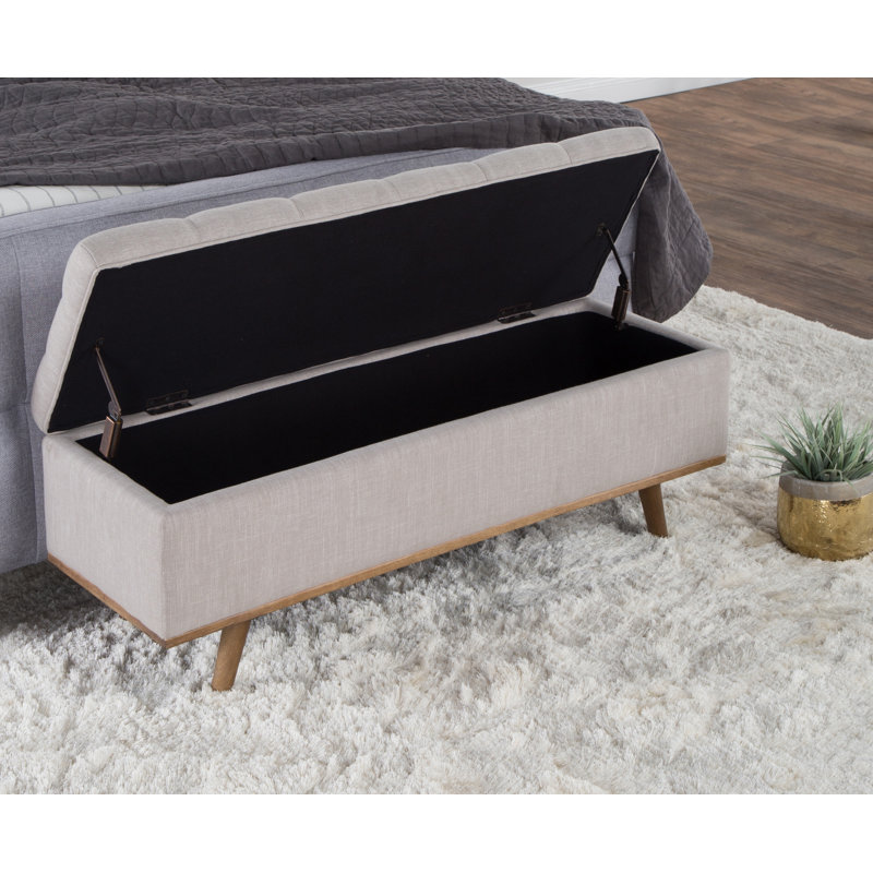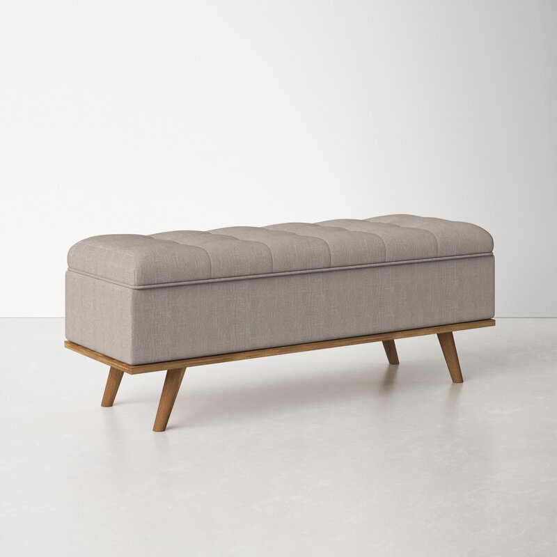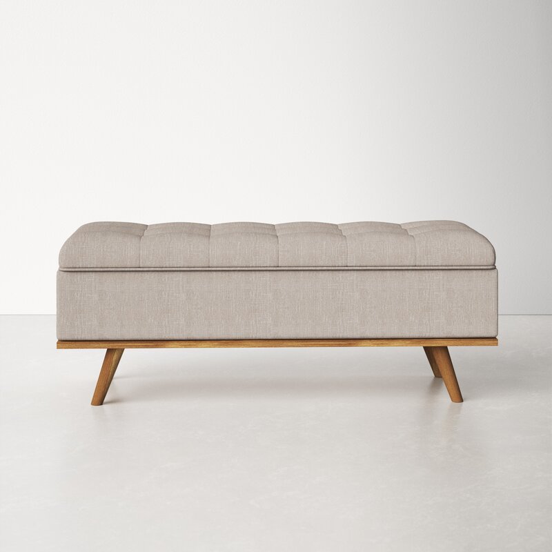 The perfect perch for pulling on your shoes in an entryway, or for rounding out a living ensemble with spare seating, benches are truly versatile accents in any home. And this one has an extra touch: hidden storage! Crafted from a wood frame, this piece is upholstered in polyester, linen, and viscose blend with foam filling for a cushioned touch. A clean-lined silhouette, button tufting, and tapered legs lend this piece a modern look in any room. The lid of this bench lifts to reveal an interior storage compartment perfect for spare linens and more.