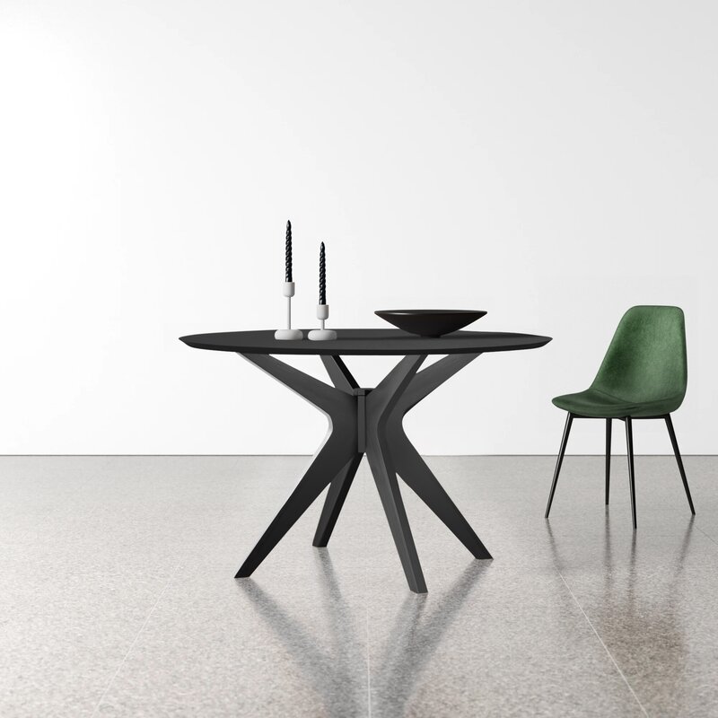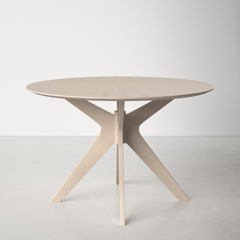Comfort food. Drawing on dynamic mid-century design elements, this inviting wooden dining table showcases a sunburst-patterned top and flared, boomerang-shaped legs. It seats up to four people for Sunday morning pancakes and Thursday night takeout.