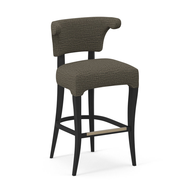A stylized Athena Barstool featuring an upholstered curved back raised over a boxed seat with gracefully curving solid Beech wood legs.
