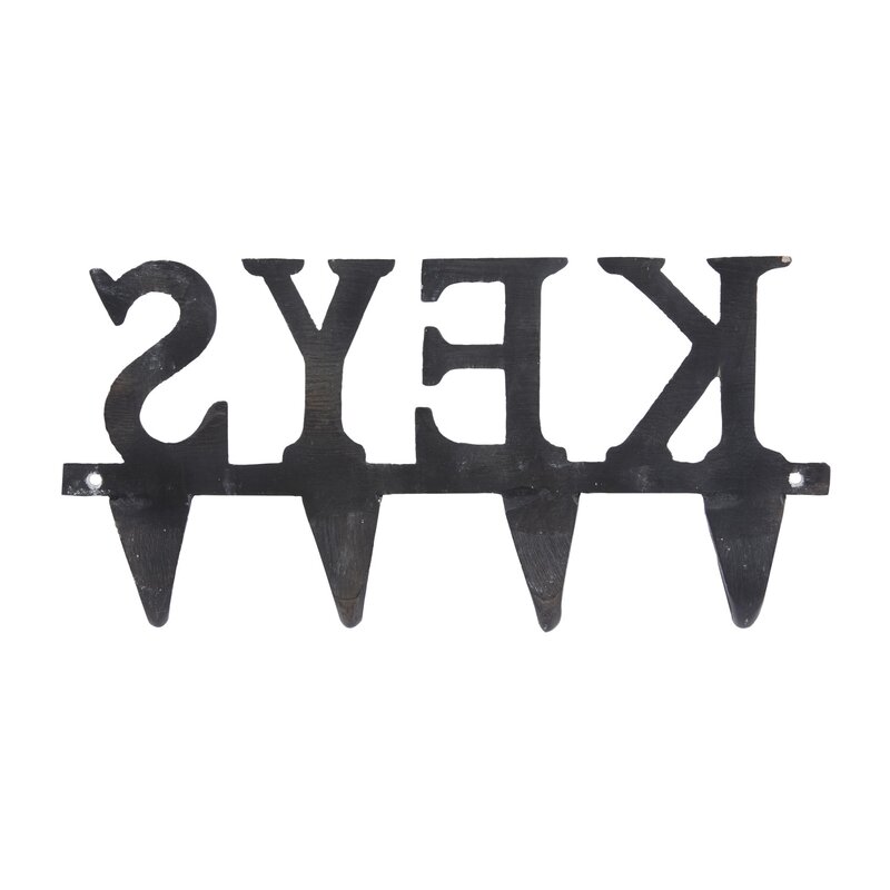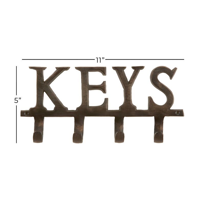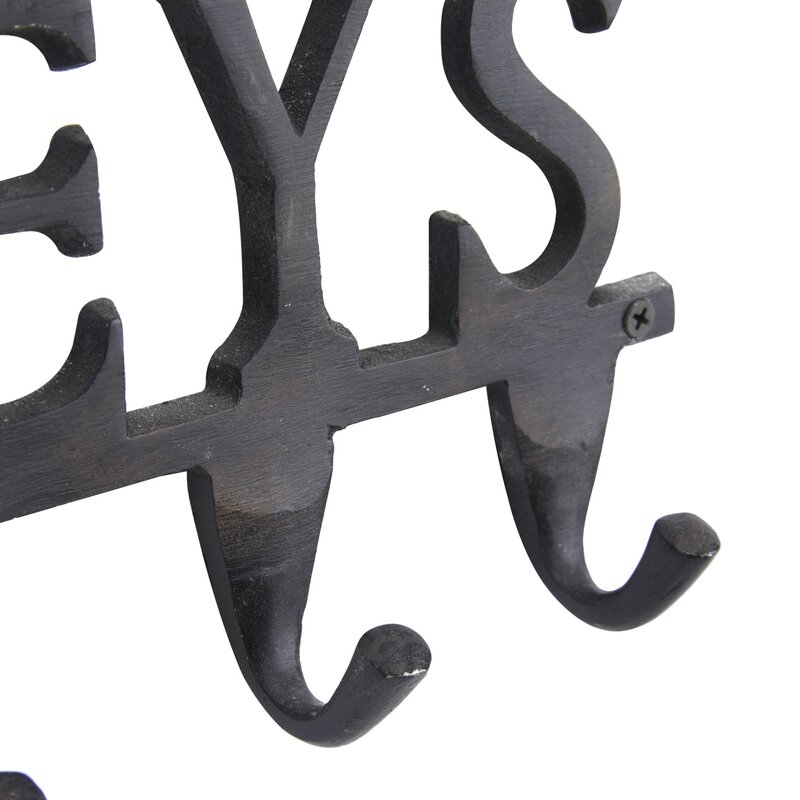 This modern key hook for the wall features four metal hooks with a capitalized “KEYS” design on the top.