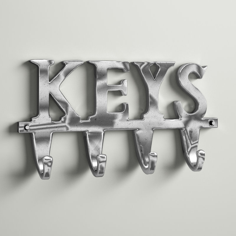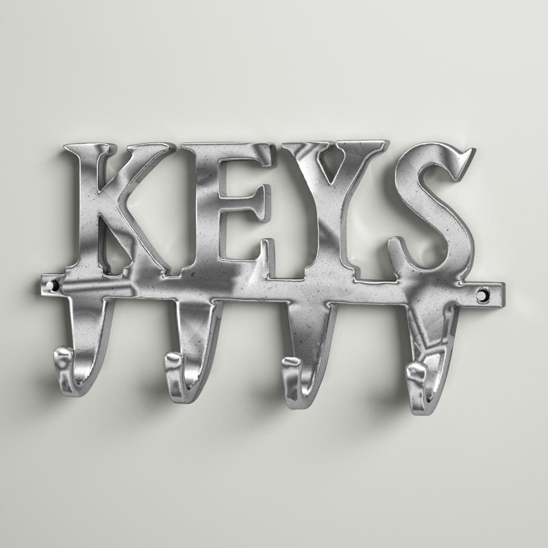 This wall hook comes with a metal-sculpted design spelling “KEYS” and four J-shaped hooks