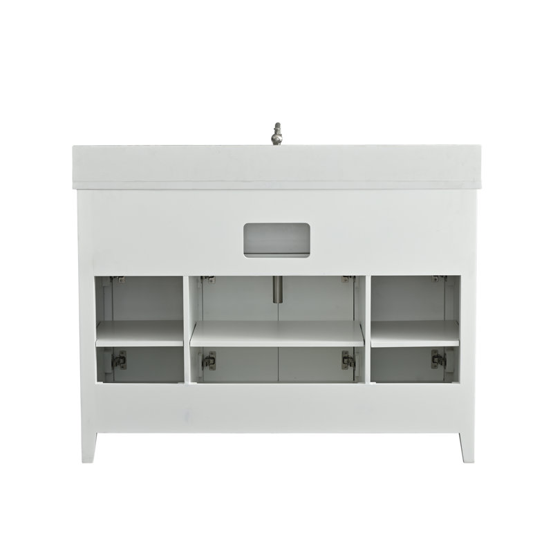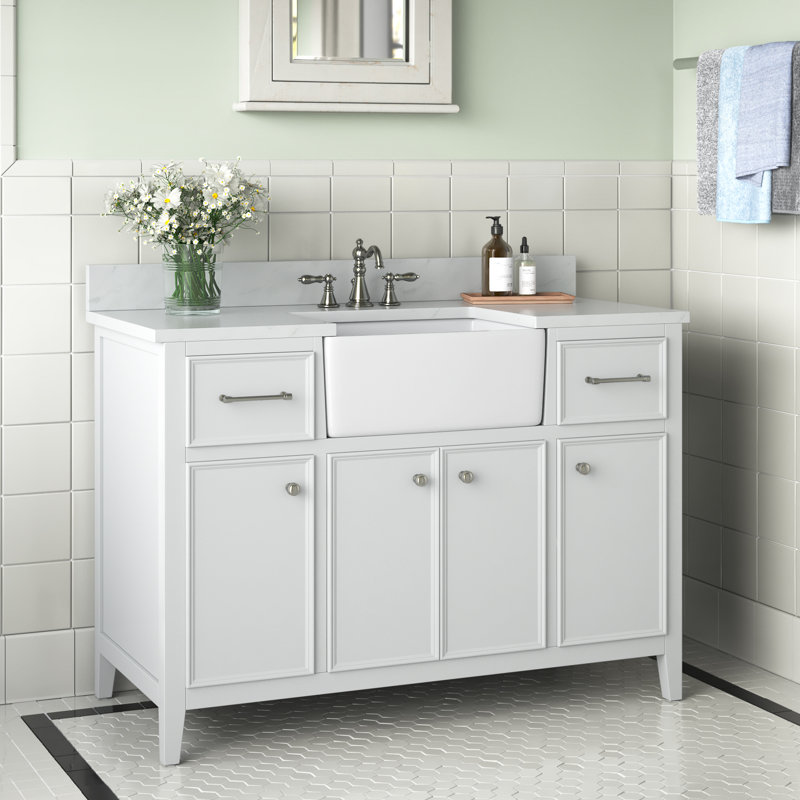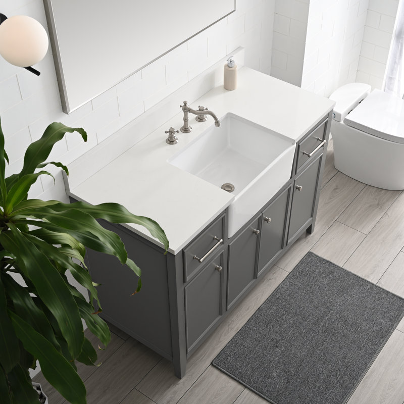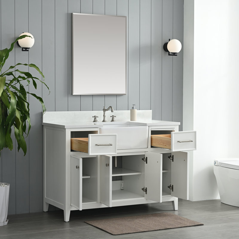 Charming and rustic, this 48″ single bathroom vanity offers the best of farmhouse-inspired style with modern touches we love. The base is crafted from engineered wood and features an integrated ceramic sink inside the white engineered stone countertop. Two soft-close drawers offer out-of-sight storage, while cabinets down below offer additional organization options for larger items. Best of all, this bath vanity comes already assembled for a quick update of your powder room with an on-trend style.
