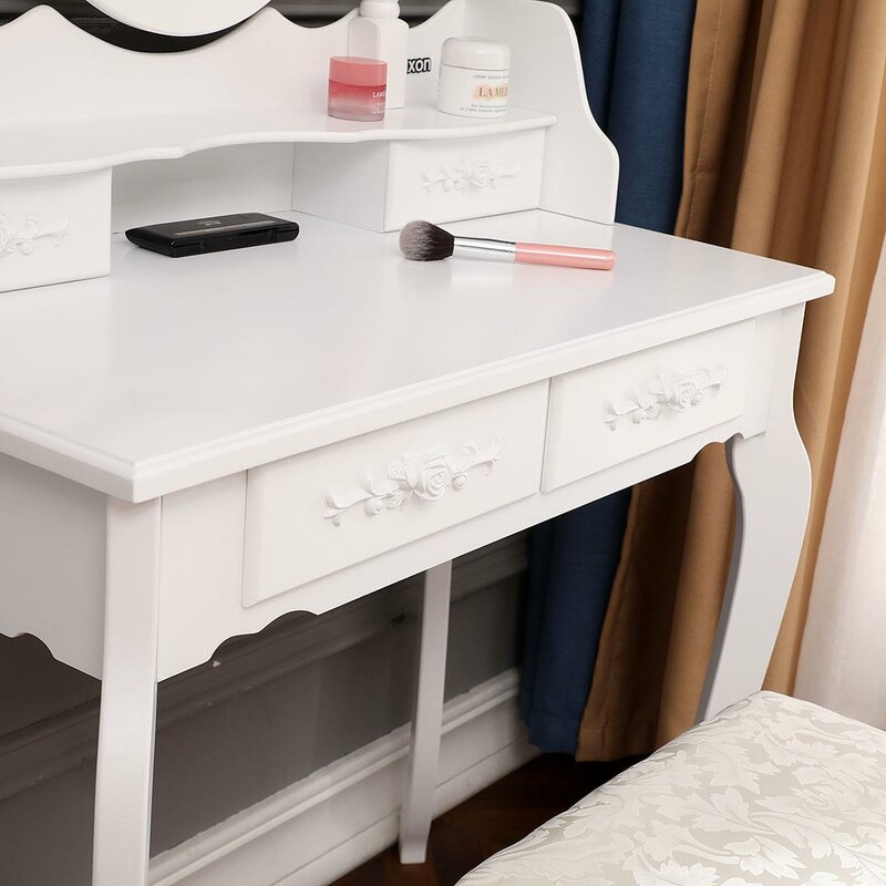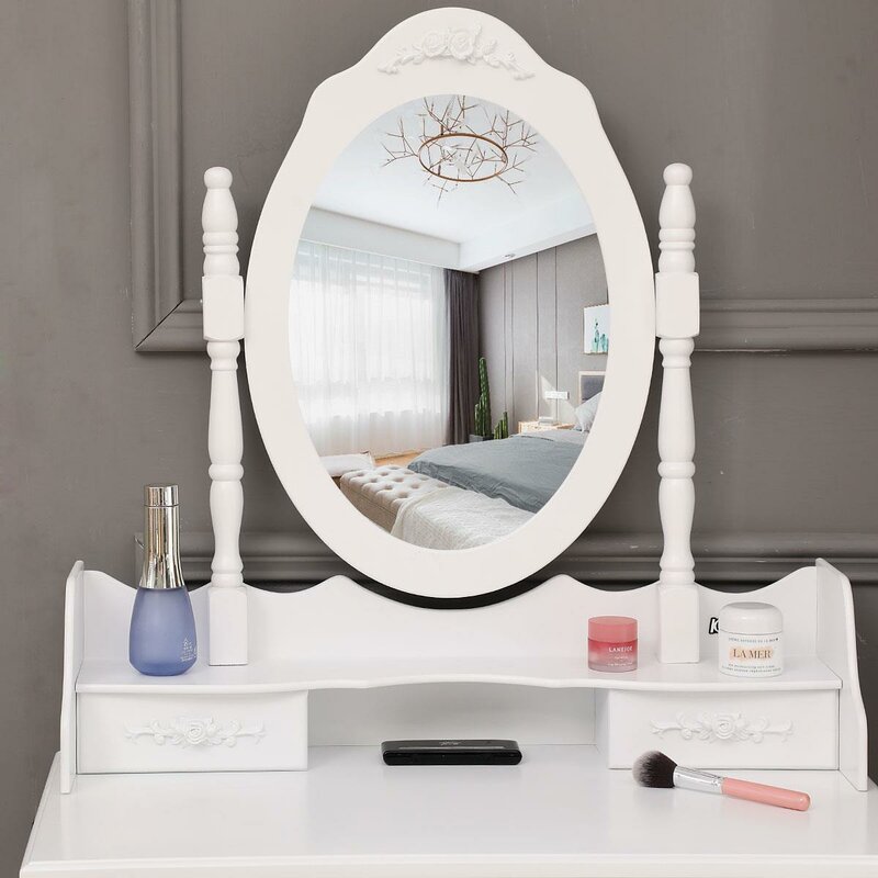This vanity set comes with a matching stool and an adjustable round mirror, so you have a spot to get ready in the morning and finish your bedtime routine. Each piece is made from engineered wood with a crisp, white finish, and it features carved flower accents along with turned detailing and cabriole legs for a more traditional look. Two drawers on the tabletop, two drawers underneath, and an upper shelf give you ample room to keep jewelry, makeup, and more organized. The stool’s seat cushion is upholstered with cotton to support you as you sit.