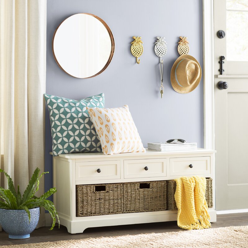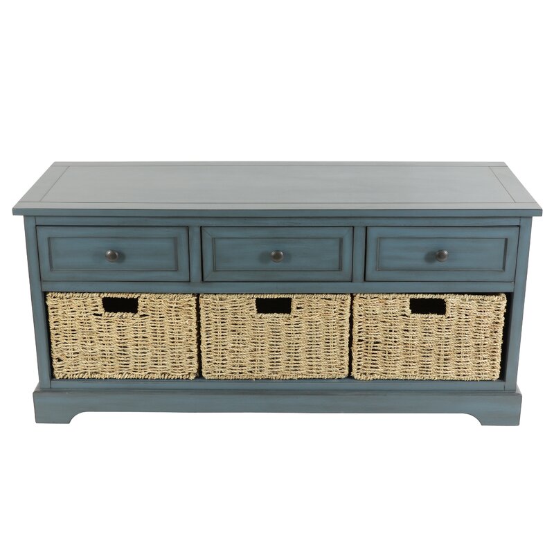 A peice from Wayfair I didnt have to put together whew. Heaven. I understand there was a risk of it coming damaged due to reviews. However it arrived in one whole peice. A few pieces of the basket fell apart but it is unnoticeable and will store shoes so I’m not worried about it.You can use with or without them. It’s small but it fits the space. I was able to pick it up and move it with ease because it was not super heavy but yet still very solid and sturdy peice. The color I purchase was Antique Ice Blue ( I wish more people showed pictures and mentioned the color they received.) It went well with my decor. I was nervous but it is just perfect. Made me want to clean up to get it set nicely lol. Pictures are up so you can decide doe yourself. Make sure you have good deliveries in the area and not too far from shipping warehouse to decipher if your peice will be cared for in delivery.