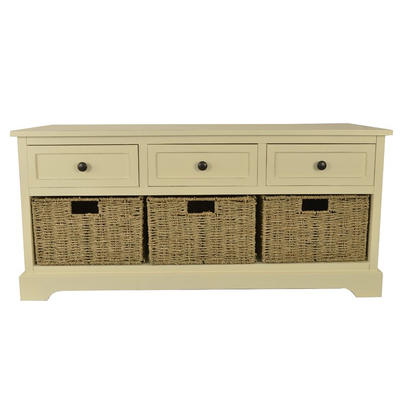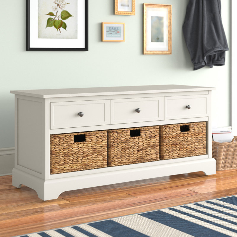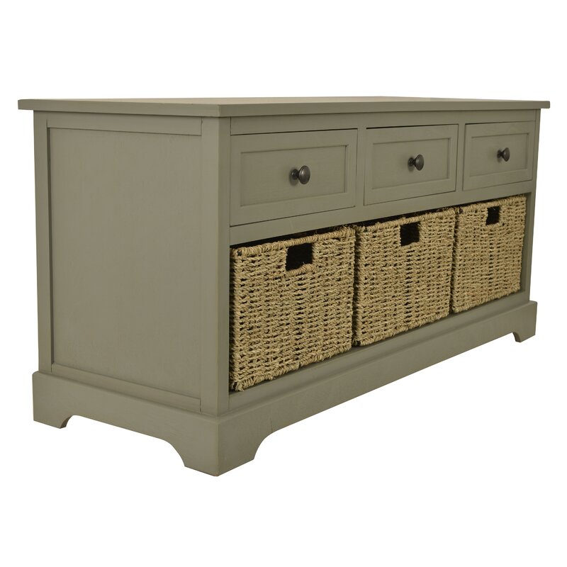 This storage bench brings classic style and a restful space to your entryway or hallway. Made from solid and engineered wood, this bench shows off traditional details and a rectangular silhouette with bracket feet and clean lines. Three wood drawers show off window pane paneling and offer storage for miscellaneous items and accessories, while an open section on the bottom has space for three basket cubes for storing shoes, gloves or scarves. Best of all, there’s room up top for sitting down as you put on your shoes.