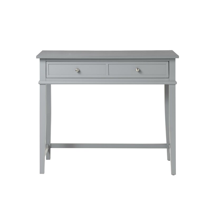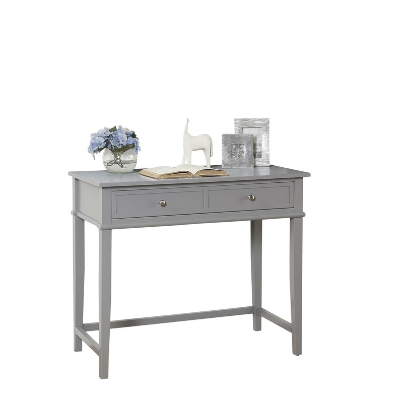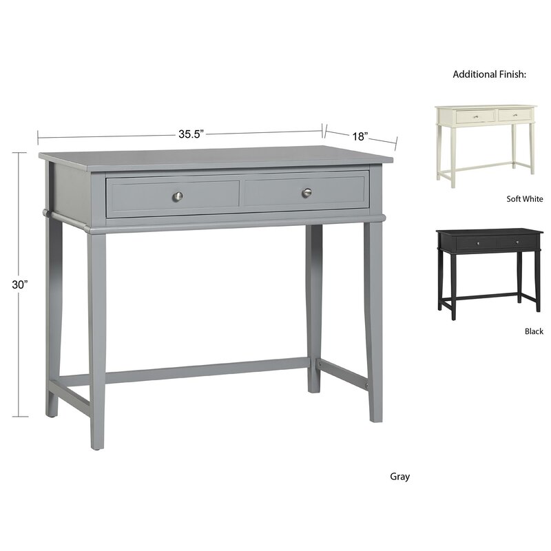 If your home office is short on space and storage, this desk is the answer you’ve been looking for. It’s made from engineered wood and has a neutral finish that pairs with decorative molding and tapered feet to give it a simple, traditional silhouette. The wrap-around stretcher bar gives you a spot to rest your feet while adding spare support and style to the desk. The single drawer has a double framed front for the look of two drawers and is spacious enough to store away your office essentials. This desk measures 35.5″, making it ideal for smaller homes with limited workspace.