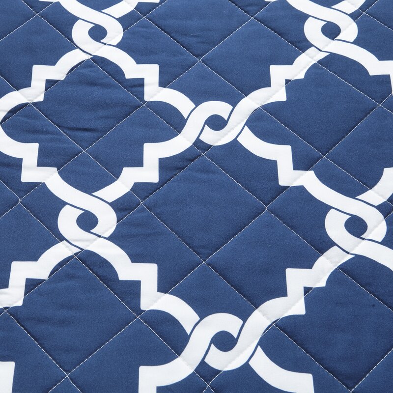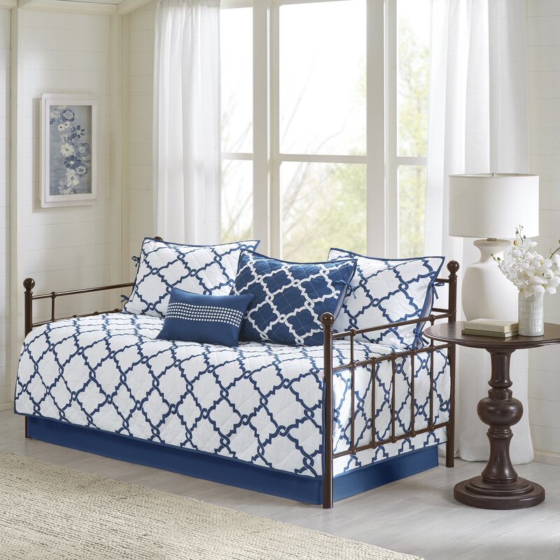 This 6-piece coverlet set adds a simple yet eye-catching pattern for a daybed in your guest room or living room. It includes a quilt, three pillow shams, an embroidered decorative pillow, and a bed skirt – all made with polyester fabric. The coverlet and the shams feature an intricate fretwork design against a colorful base that flips the color scheme on the reverse. Deep pockets on the coverlet make it a cinch to fit over the edges of your bed for a crisp, clean look. Bonus: Toss this set into the washing machine whenever it needs a refresh.