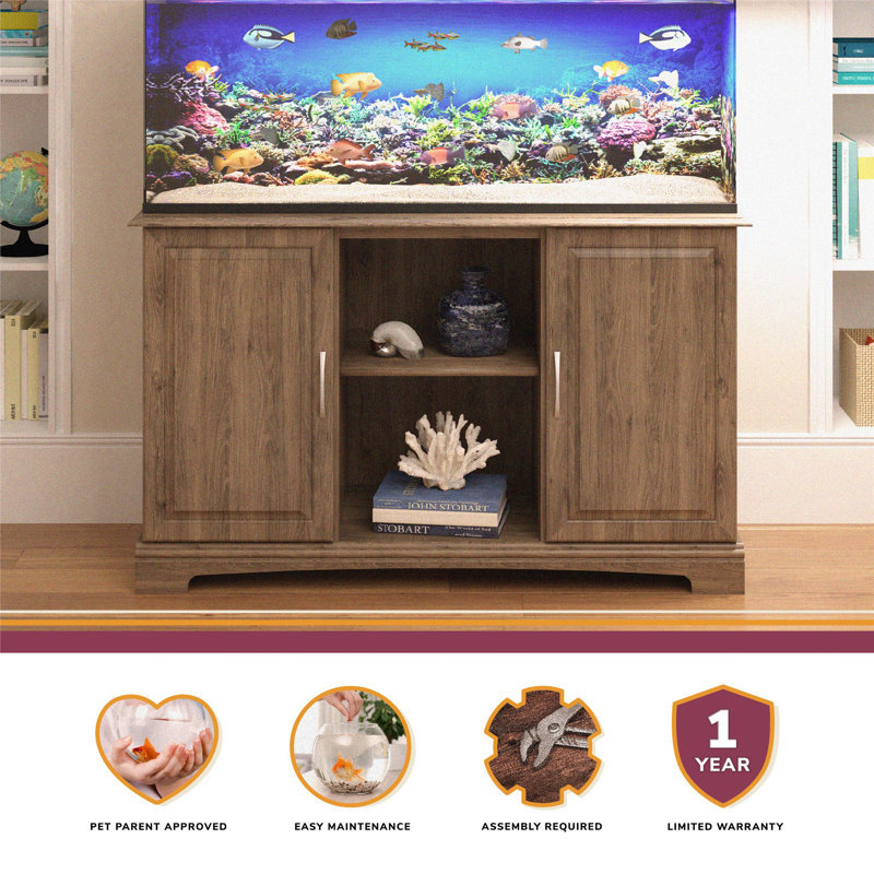 This aquarium stand is just the thing to show off your 75-gallon aquarium filled with all your favorite goldfish, guppies, bettas, rainbow fish, and so much more. It features two open shelves in the middle, and two shelves behind each cabinet door on either side, for plenty of display and concealed storage of books, decorative accents, fish food, and so much more.
