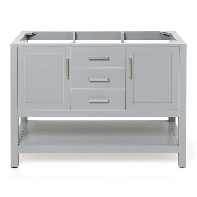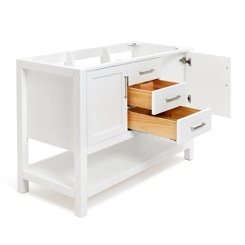 The vanity base features a sturdy cabinet with a solid wood frame and an open shelf at the bottom to meet all your storage needs. Soft-closing doors and self-closing doors are standard for all bath vanities and cabinets.
