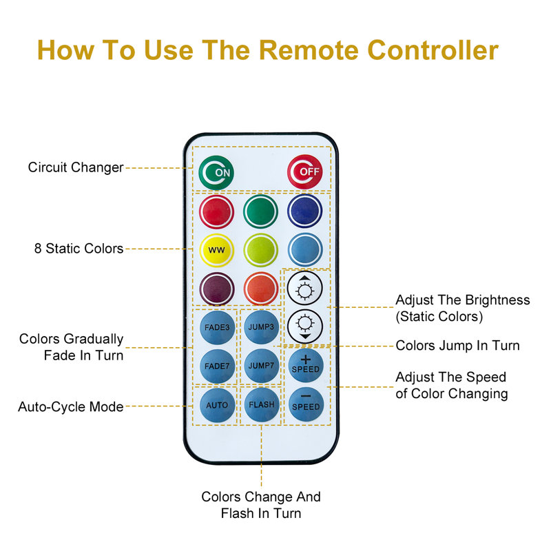 RGB LED pathway lights with 4 modes(Flash/Strobe/Fade/Smooth) &8 colors(Built-in independent warm white LED chips), 3 brightness dimmable by included remote controller.