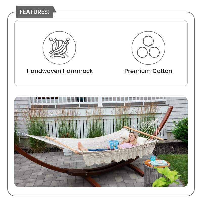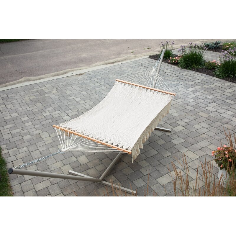 The Bahia close weave crochet outdoor hammock adds comfort to the quality time that you spend outdoors. This versatile single hammock for outside can accent your patio furniture, add more comfort to your backyard, or be your go-to lounge spot on the porch. Bring it along while traveling and relax near the campfire with this comfortable tree hammock. The durable patio swing has been hand crafted with high grade cotton yarn and will add a bit of luxury to your life. Take a moment to enjoy the simpler things in life while you sit back and relax on this 52 x 79 inch one-person hammock. This rope hammock has hardwood spreader bars and zinc plated rings. Spend time relaxing in this swing chair that has a weight capacity of 250 pounds.