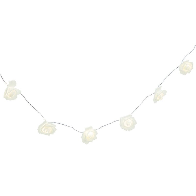 Add some glow to your special day! Great for wedding décor, this set of string lights features a blooming design of white roses. Lay across the center of the head table, string around pillars, use in a DIY photo booth—truly the options are endless. Beyond big days, string lights like this are a shimmering addition to home décor! Requires 2 “AA†batteries, not included.