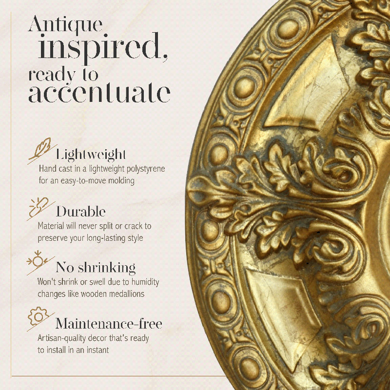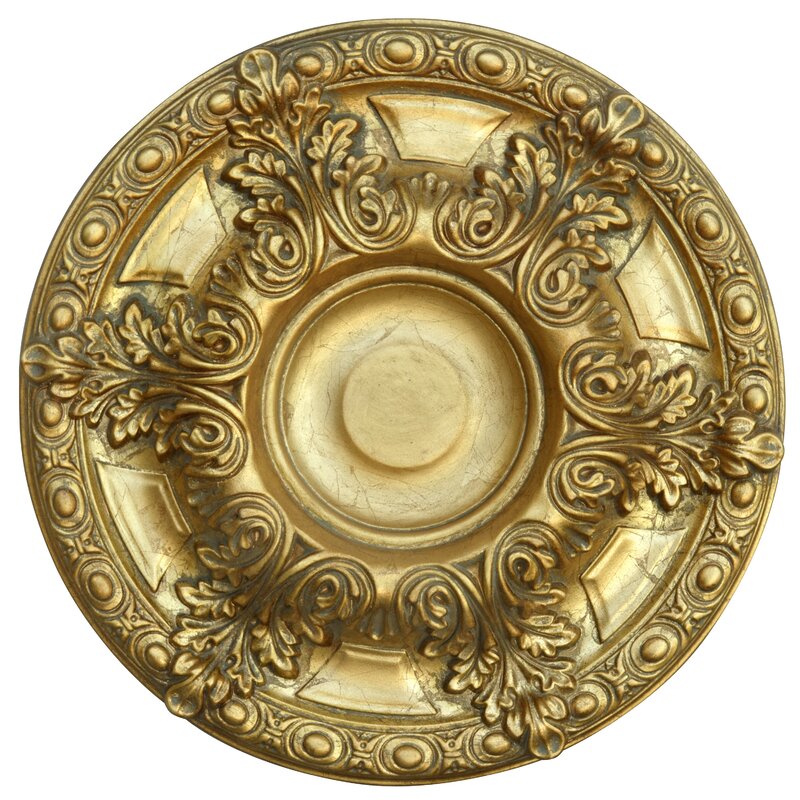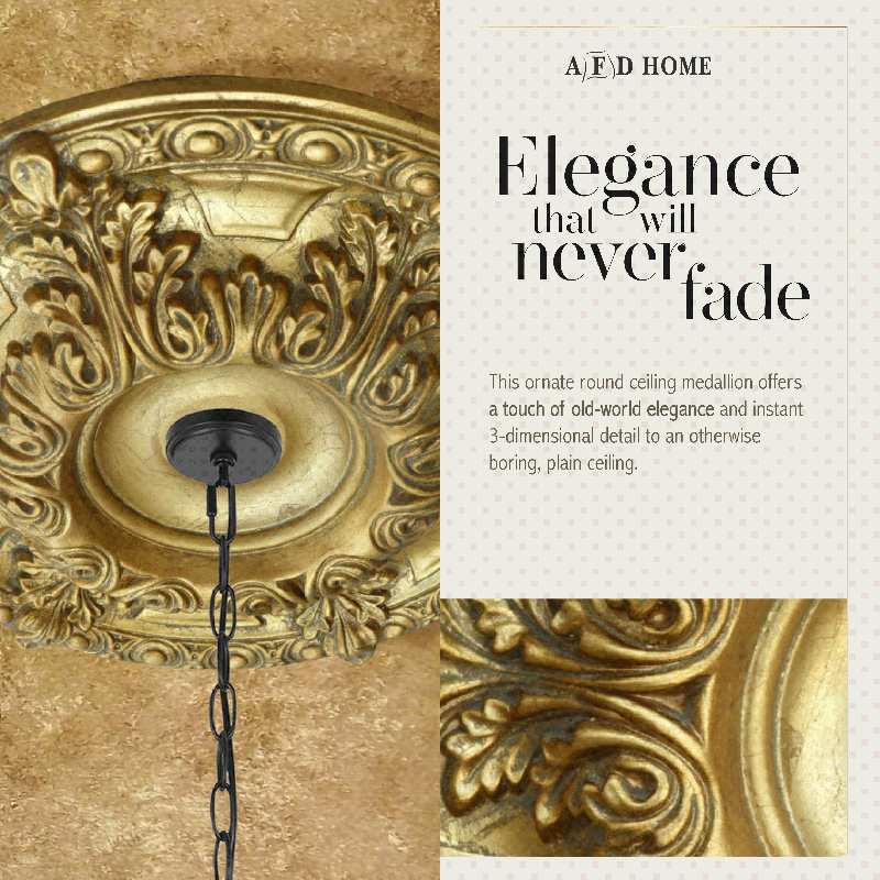 The Golden Acanthus Leaf Ceiling Medallion is 23 inches in diameter featuring a hand applied gold leaf finish. A 1.5 inch center space is available to be cut out for use in lighting and ceiling fan applications. Raised accents give the decorative ceiling medallion rich depth that adds beauty to any chandelier, fan, or light fixture. Light weight, these decorative ceiling medallions are precision cast using durable polymers that are non-shrinking and 100 percent waterproof. Installation can easily be done with architectural adhesive and finishing nails. Instantly provide your ceiling space or walls with rich architectural details that are long lasting, maintenance free, and add value to your home giving you the look of expensive custom crown molding trim work at an affordable price.