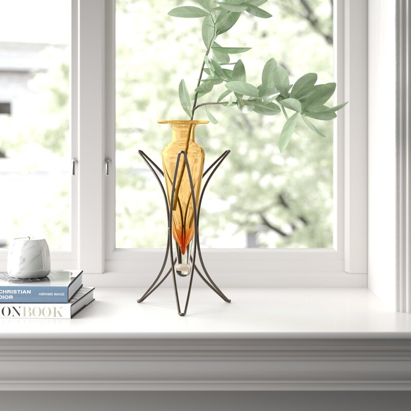 Display your favorite florals and blooms in sophisticated style with this lovely vase. The classic glass design is elegantly supported by a black base comprised of three half-moon arches for a look that elegantly blends traditional style with artful appeal. Try setting this vase at the center of your dining room table, then fill it with a bouquet of deep red tulips to craft a stately centerpiece. Next, build on the traditional aesthetic by pulling up six gray linen Parsons chairs and dotting your walls with framed oil paintings. If you want a pop of drama, you can also try hanging a shimmering chandelier overhead to light your space in style.